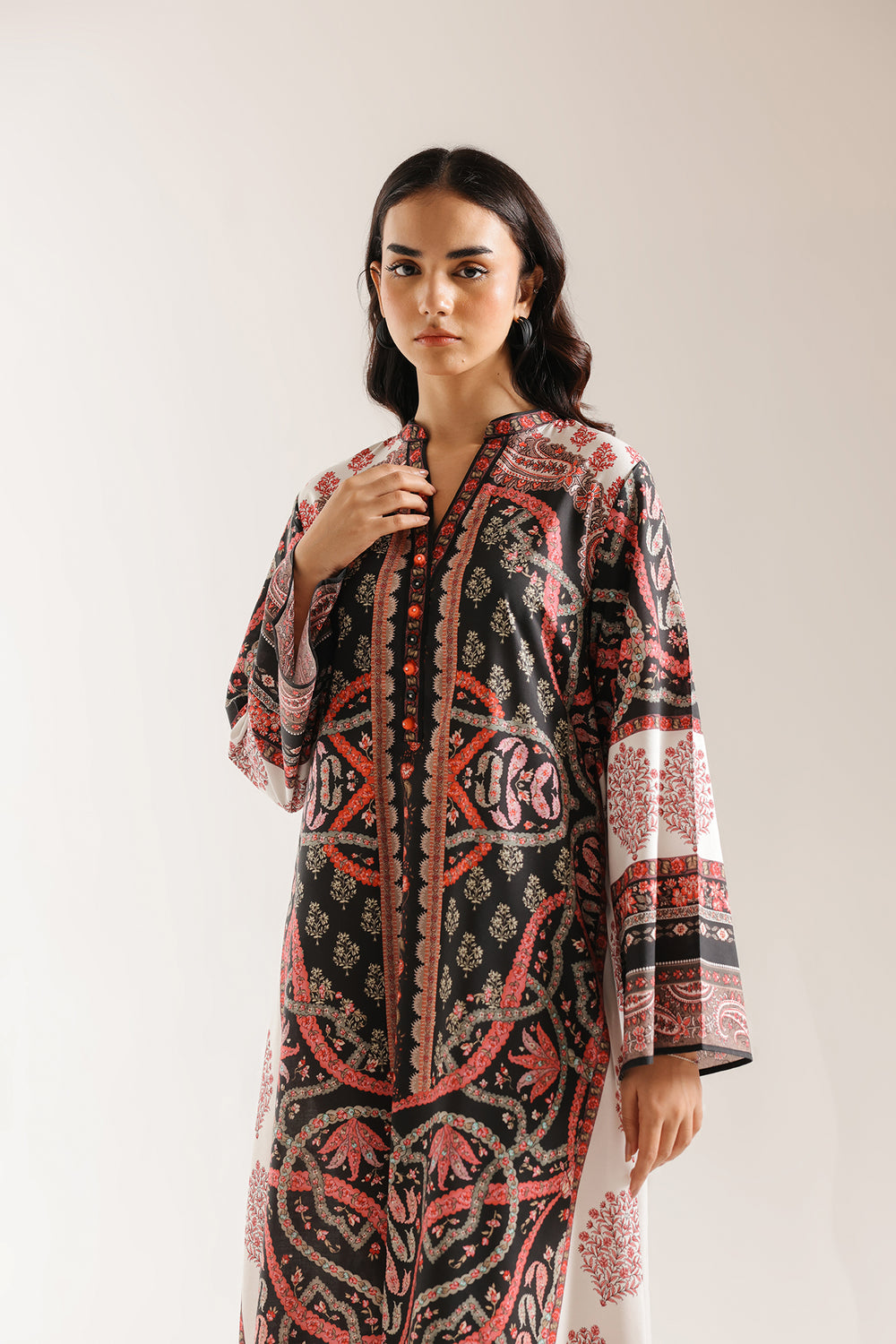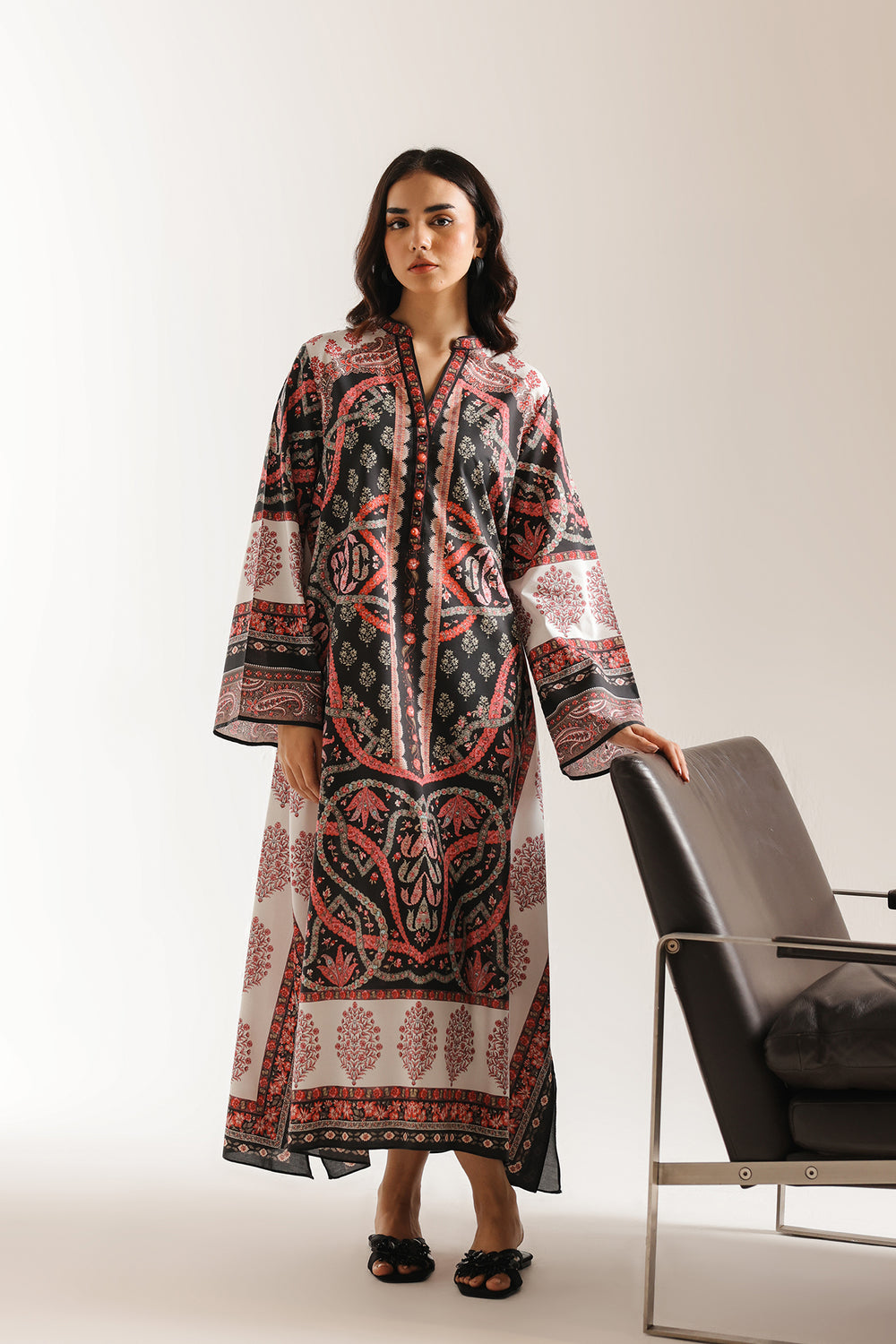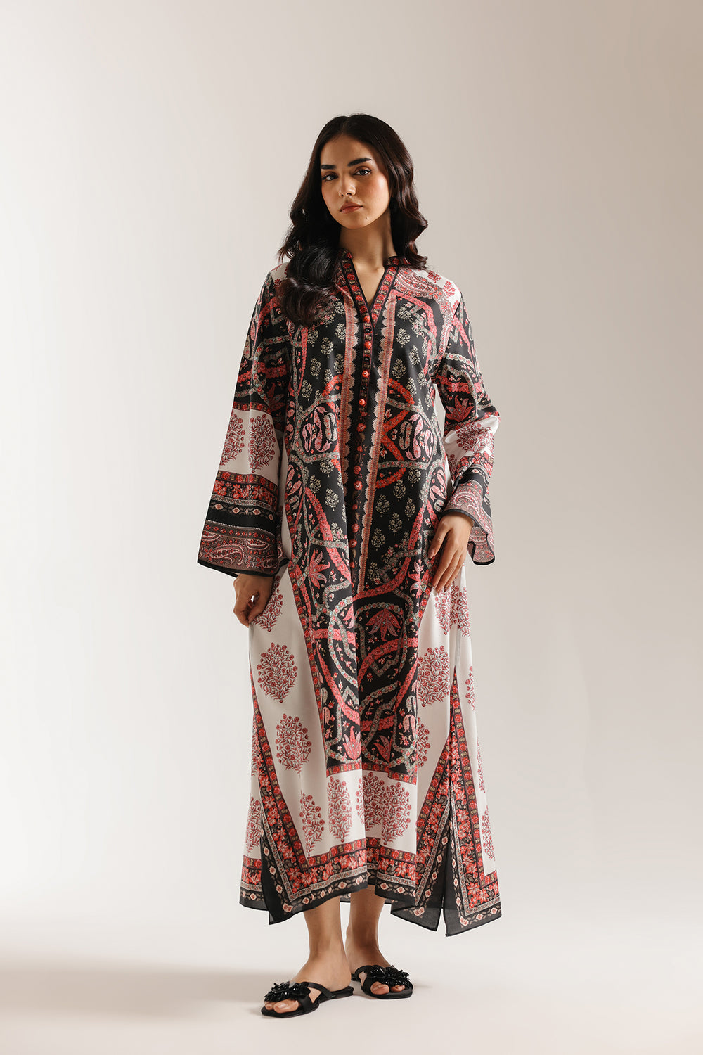 A refined stone-colored long printed dress showcasing a graceful V-neckline and comprehensive full-length sleeves that deliver elegant coverage. Discreet vents positioned at the hem facilitate ease of movement while preserving the dress's polished aesthetic. Decorative button details adorn the front for visual dimension to the silhouette. the printed pattern adds subtle textural interest throughout, luxury in ethnic wear with refined artisanal execution.