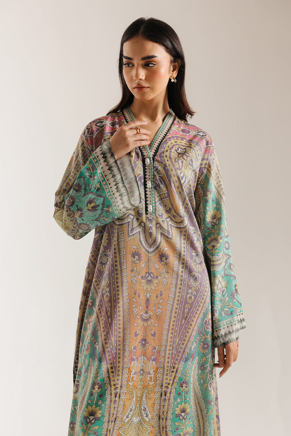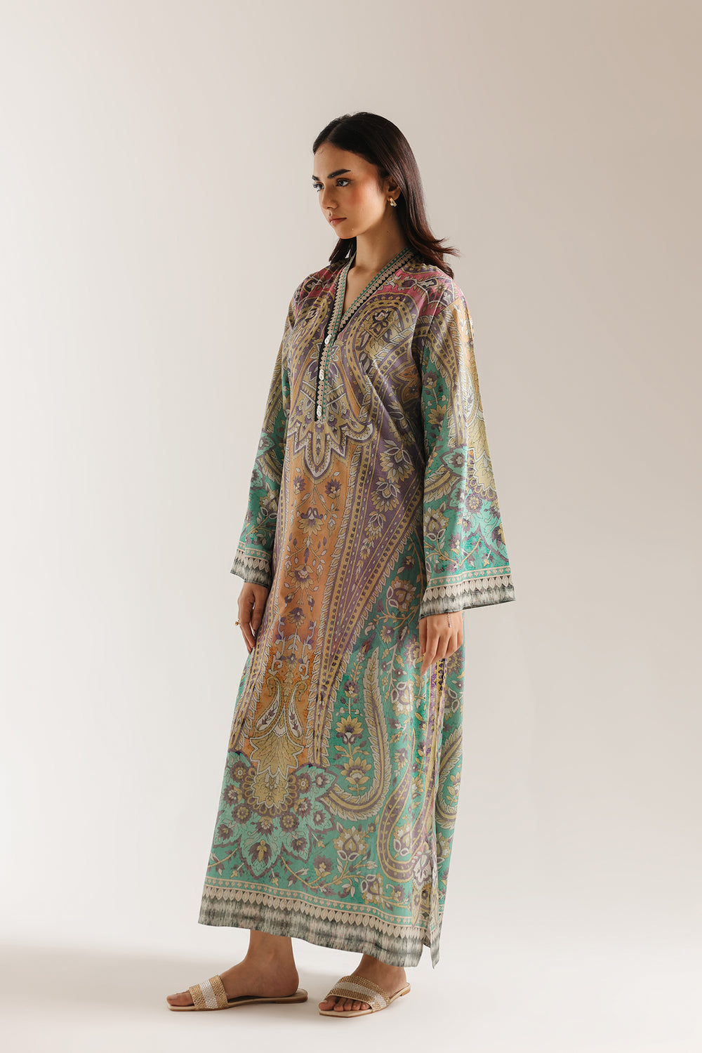 Experience refined sophistication with this V-neck long printed dress featuring full sleeves in a serene dull green hue. The complete sleeve coverage provides elegant modesty, while the v-neckline with buttons adds a contemporary touch to the traditional silhouette. Thoughtfully placed prints enhance the design without compromising the calming green tone that serves as the foundation of this piece. The extended length and structured sleeves create a polished, composed aesthetic suitable for diverse occasions.