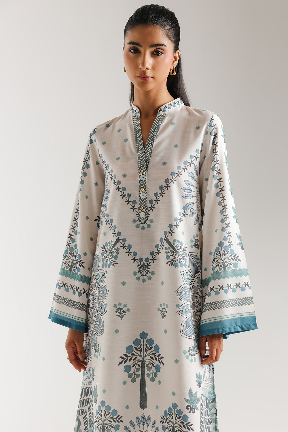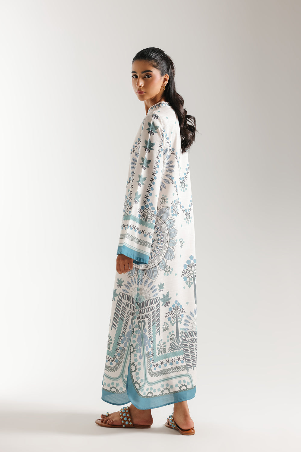 Embrace a calm and sophisticated aesthetic with this printed dress, showcasing an intricate blend of traditional and nature-inspired motifs. The design is characterized by symmetrical, slate-blue floral and tree patterns that cascade down the front, framed by a delicate V-shaped geometric border. A refined V-neckline with a small standing ban and a dainty buttoned placket adds a polished and tailored touch to the ensemble. This piece features long, straight sleeves and a flowing long-line silhouette, finished with a solid teal border at the cuffs and hem for a clean, high-contrast look.