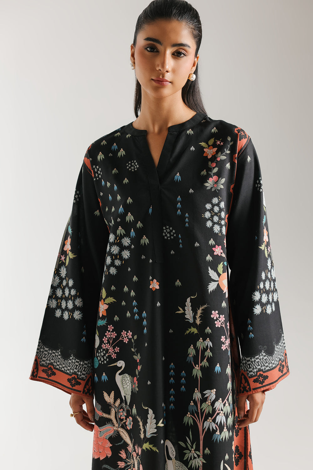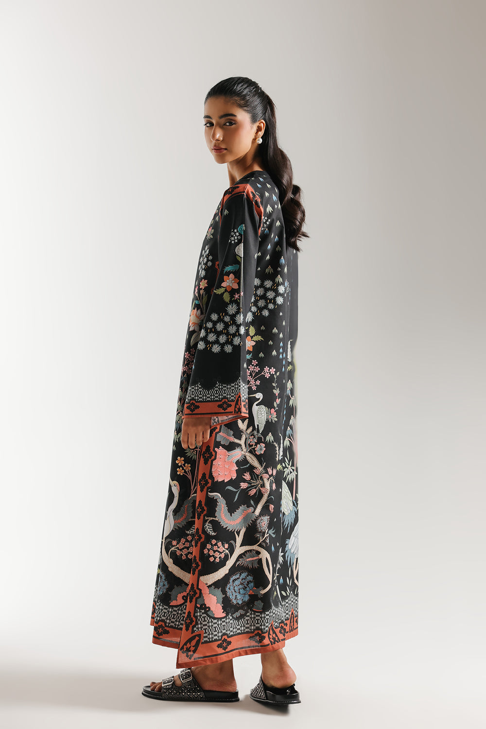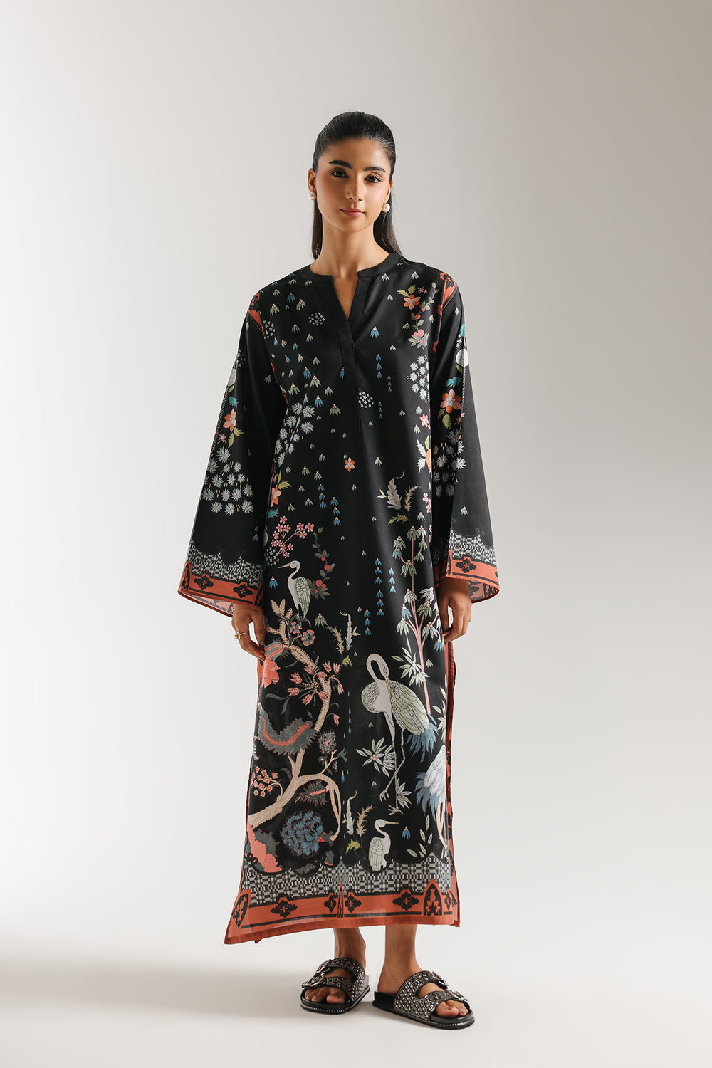 Step into a world of artistic storytelling with this striking black printed kaftan, featuring an intricate nature-inspired design of elegant herons and blooming trees. The jet black canvas is beautifully adorned with whimsical bird illustrations and scattered floral sprays in soft peach, blue, and ivory tones. A clean V-neckline with a small standing collar provides a structured and polished finish to the relaxed silhouette, while the wide flared sleeves and long-line hem are framed by a rich terracotta and grey geometric border. With its graceful, airy drape and side slit details, this kaftan offers a modern look that is both effortlessly chic and comfortable.