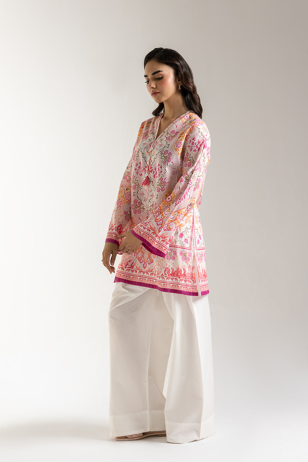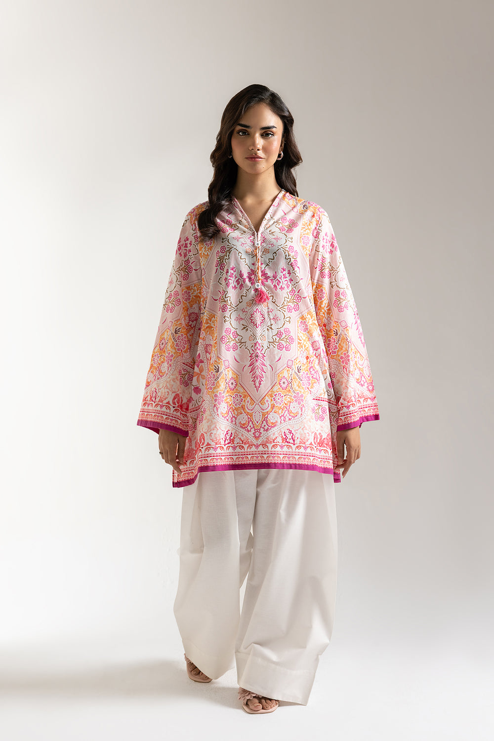 Bloom in beauty with our enchanted garden tunic. This delightful shirt is a symphony of soft pinks, sunny oranges, and delicate whites, adorned with an intricate tapestry of floral and paisley motifs. Crafted for effortless elegance, its flowing silhouette and charming tassel details create a look that's both vibrant and gracefully feminine. Perfect for adding a touch of spring to any season.
