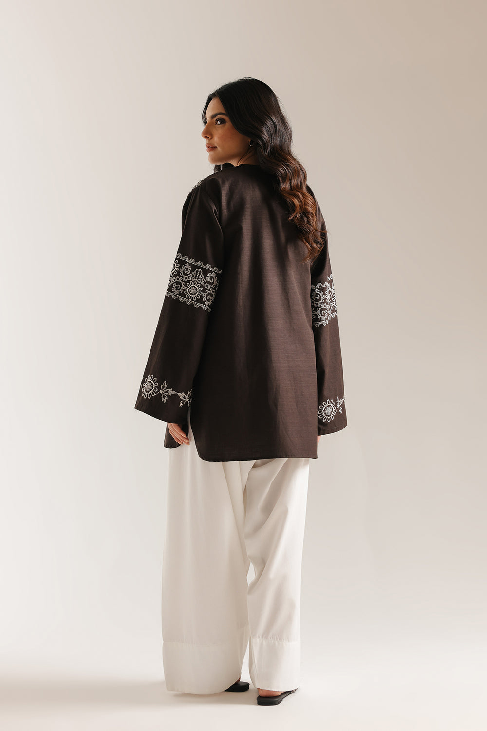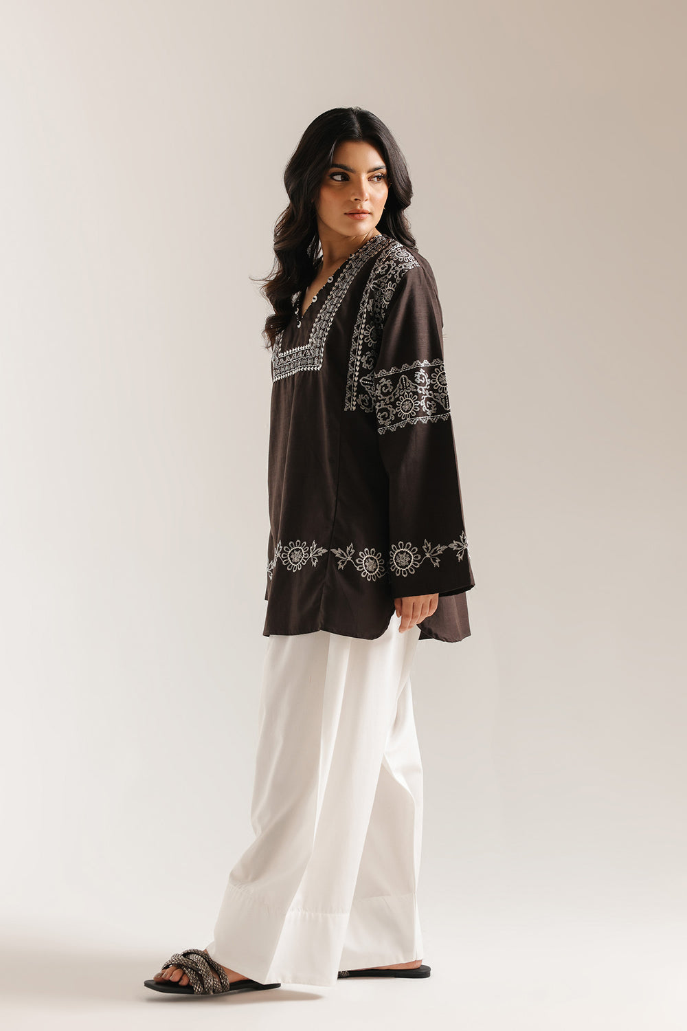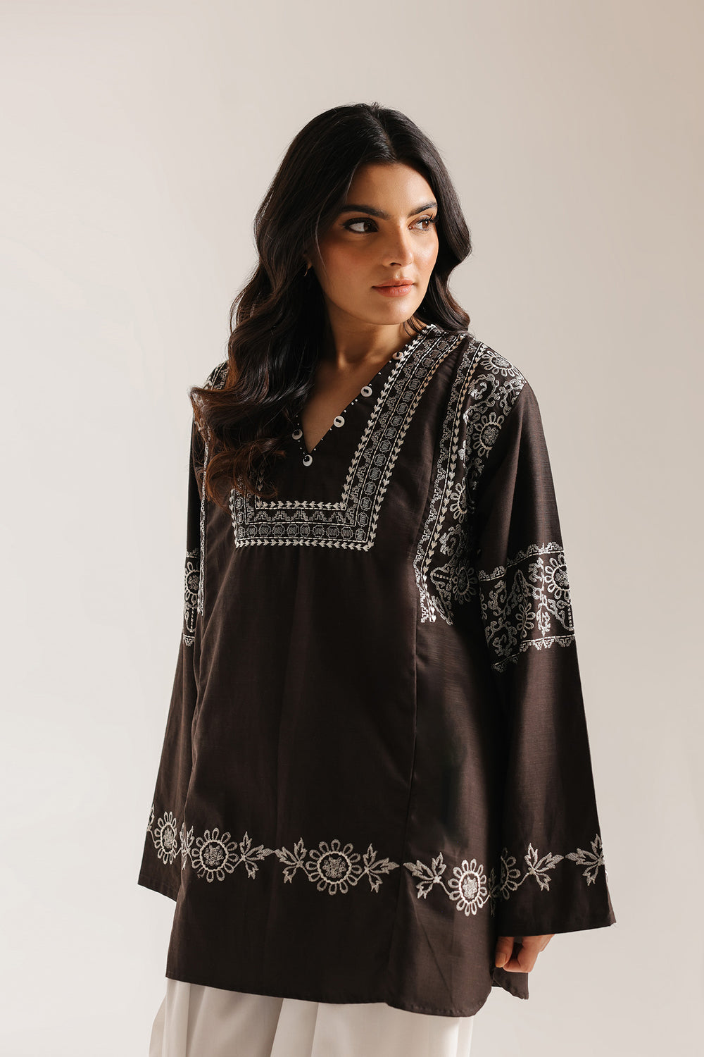Elegant anthracite grey shirt featuring delicate white embroidery details. The flattering V-neckline adds a modern touch to this traditional piece. Perfect for casual gatherings or everyday wear, this kurti combines comfort with timeless style. The intricate embroidery work showcases fine craftsmanship, making it a versatile addition to your wardrobe that pairs beautifully with simple bottoms or dupattas.