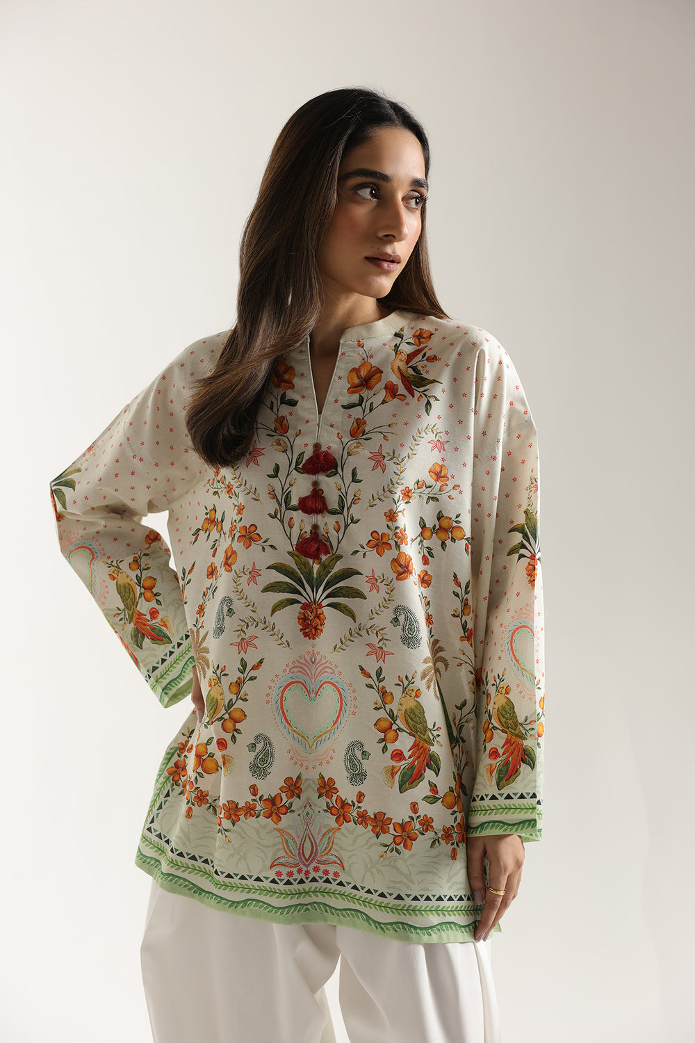 Elegant floral printed kurti designed for everyday wear. Features a classic ban neckline with a front slit for easy movement and comfort. Full sleeves provide coverage while the short length keeps it light and versatile. Perfect for pairing with leggings, pants, or traditional bottoms. The vibrant floral print adds a fresh, feminine touch to your wardrobe. Ideal for casual outings, family gatherings, or relaxed days at home