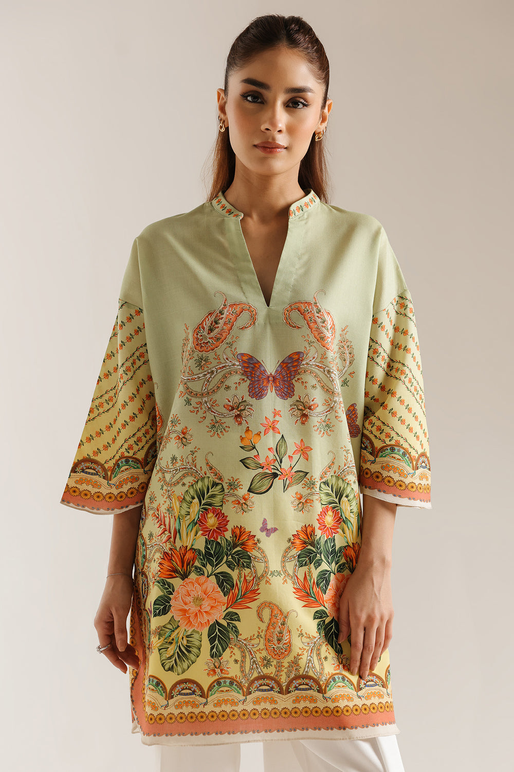 A pastel green kurta with a beautifully detailed floral print. The design showcases vibrant shades of orange, pink, and green, creating a lively yet elegant look. The V-shaped slit neck for a clean, modern finish, and three-quarter length with printed borders and straight cut with intricate border detailing in a warm tone. Overall, it's Fresh, feminine, and perfect for casual daytime wear.