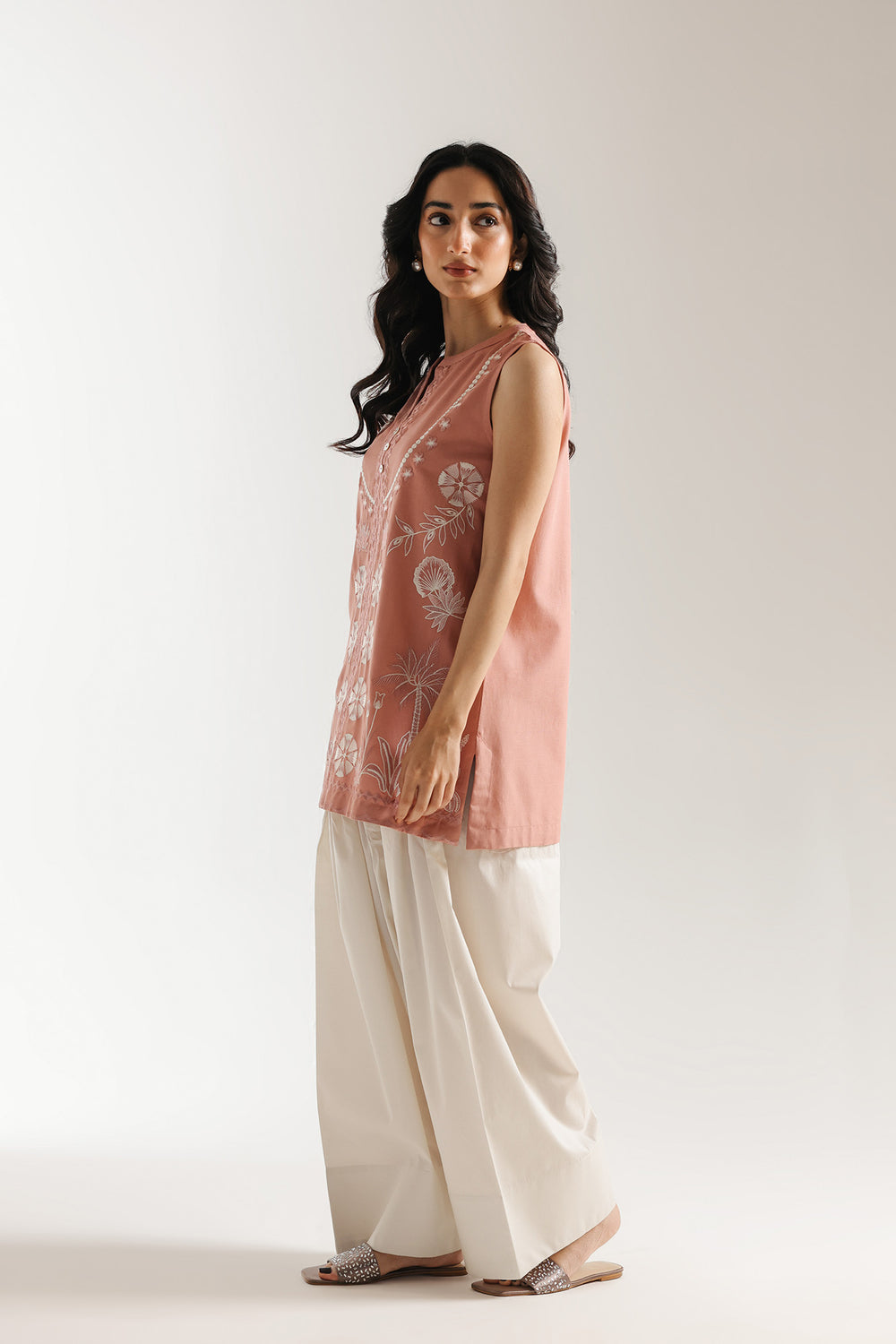 Elevate your everyday elegance with this beautifully embroidered kurti. Crafted in a soft blush pink hue, the sleeveless silhouette features delicate white thread embroidery arranged in graceful floral and geometric motifs across the front. A neatly finished round neckline with a subtle slit adds a refined touch, while the straight, relaxed fit ensures effortless comfort. Light, airy, and timeless, this kurti is perfect for warm days, casual outings, or understated festive styling.