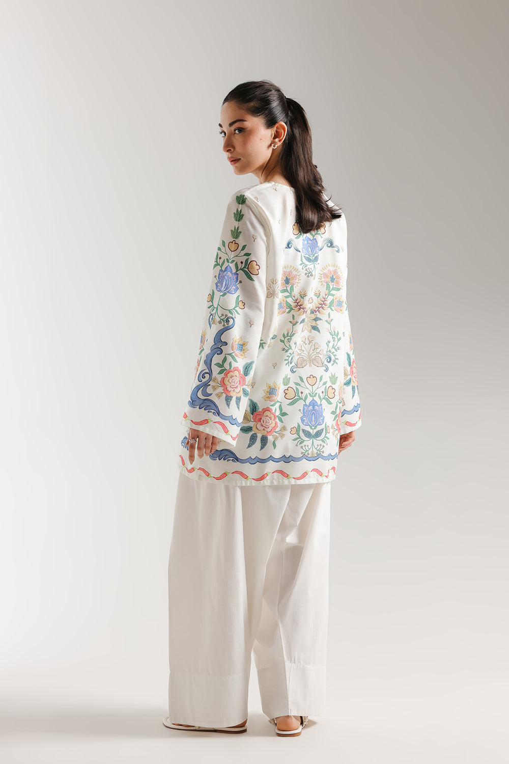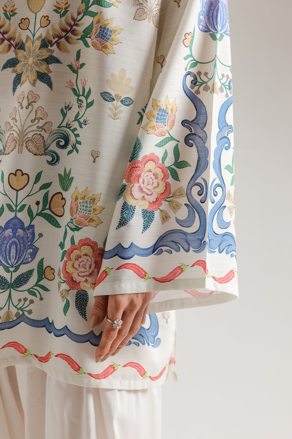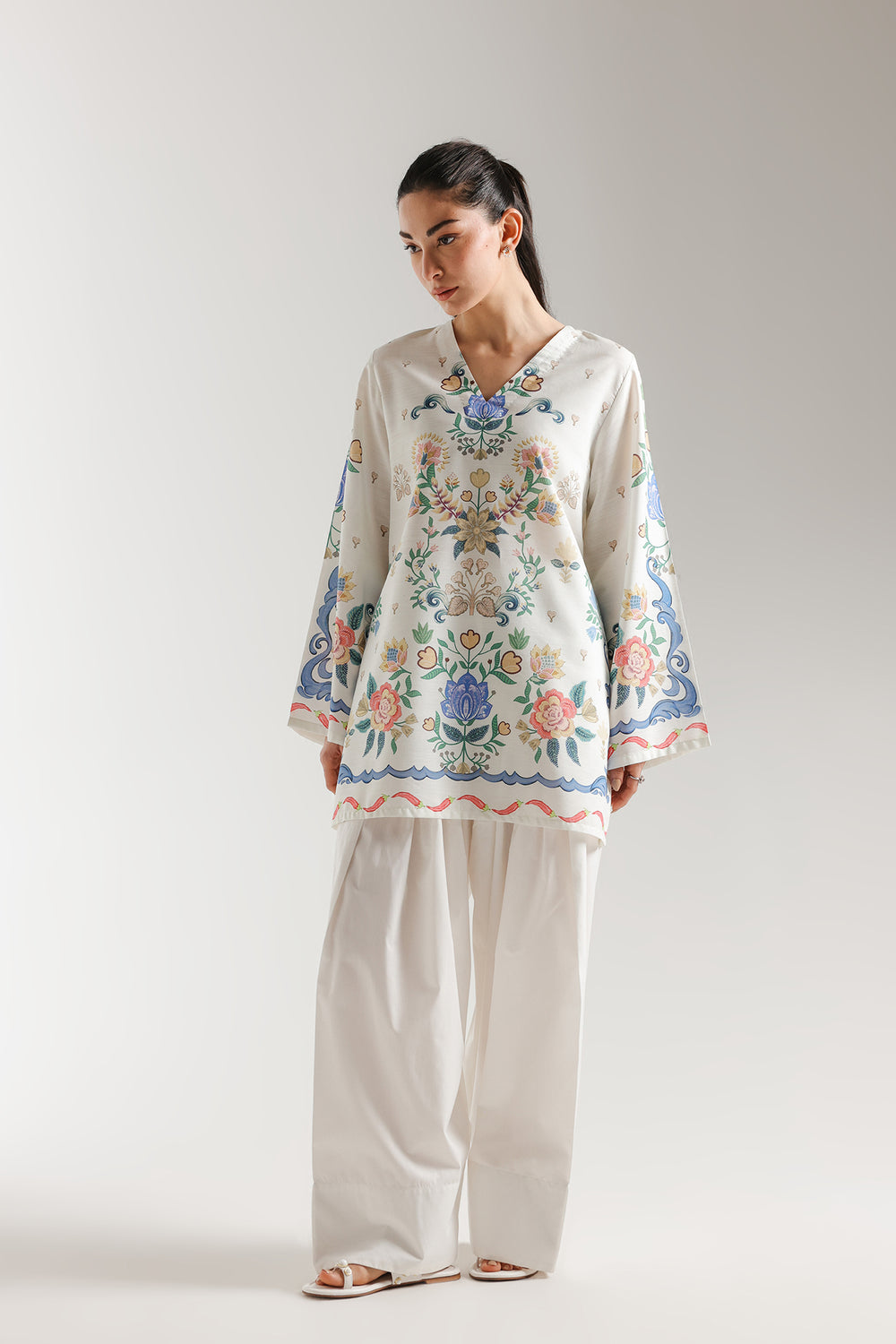 Embrace a vibrant and artistic aesthetic with this printed kurti, featuring a symmetrical botanical design in a refreshing palette of sky blue, rose pink, and golden yellow. The shirt is adorned with lush floral bouquets and scrolling vine motifs that frame the V-neckline and cascade down the front and wide flared sleeves. Intricate blue scalloped borders and delicate red ribbon patterns define the hemline and cuffs, adding a whimsical and polished touch to the relaxed-fit silhouette. Crafted for effortless grace, this kurti offers a breezy and modern drape that is perfect for a chic daytime look.