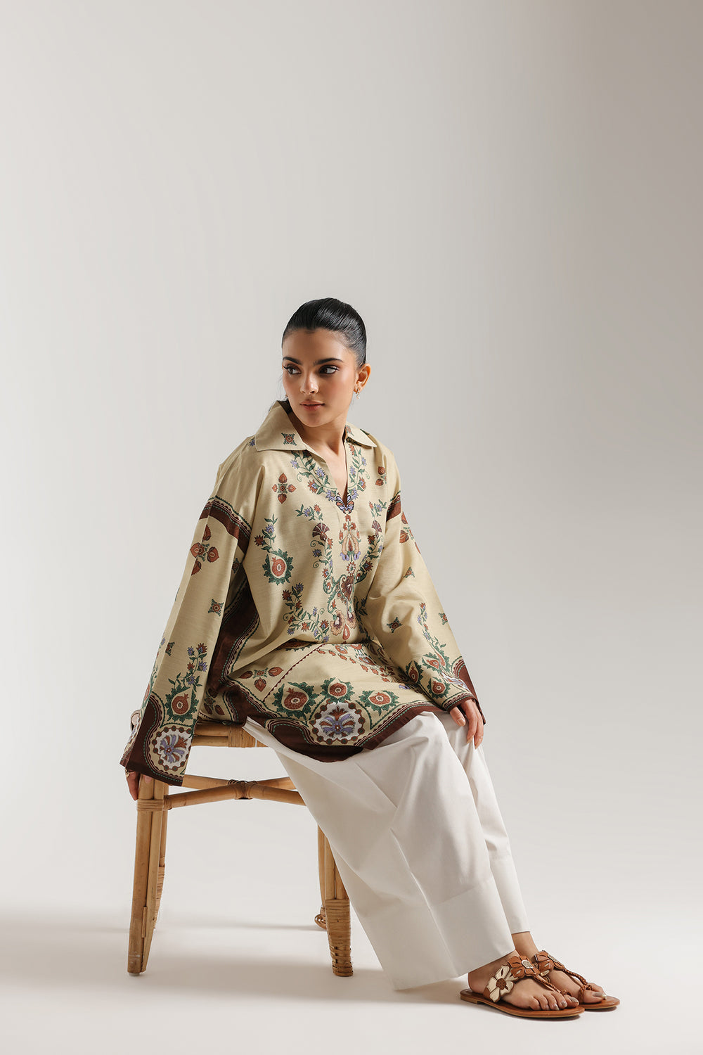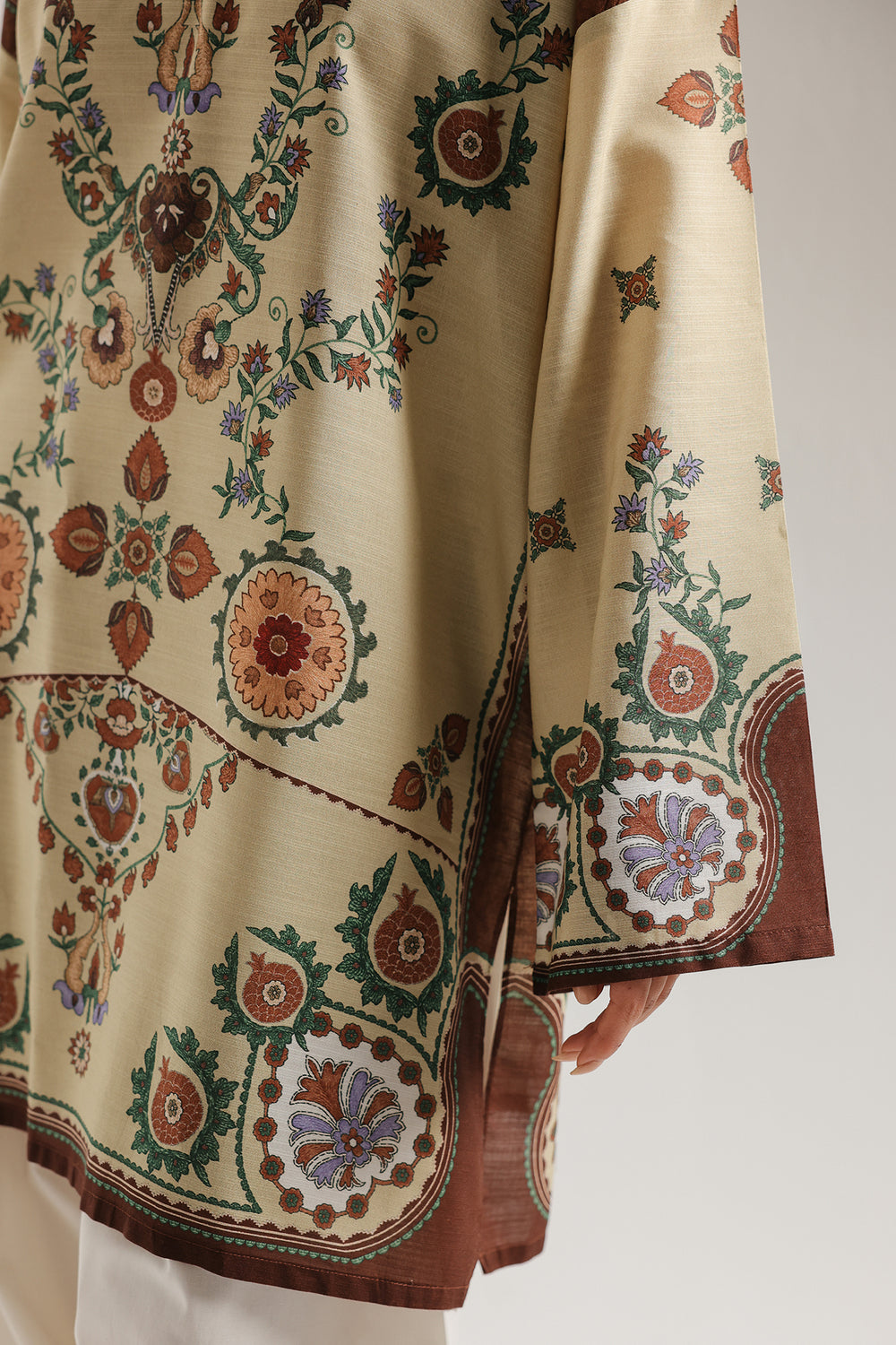 Transport yourself to an era of vintage charm with this ivory printed kurti. Adorned with a magnificent tapestry of rust and teal floral motifs, the design features a structured collar and dramatic, wide sleeves for a regal touch. It is an exquisite fusion of heritage artistry and modern, effortless grace.