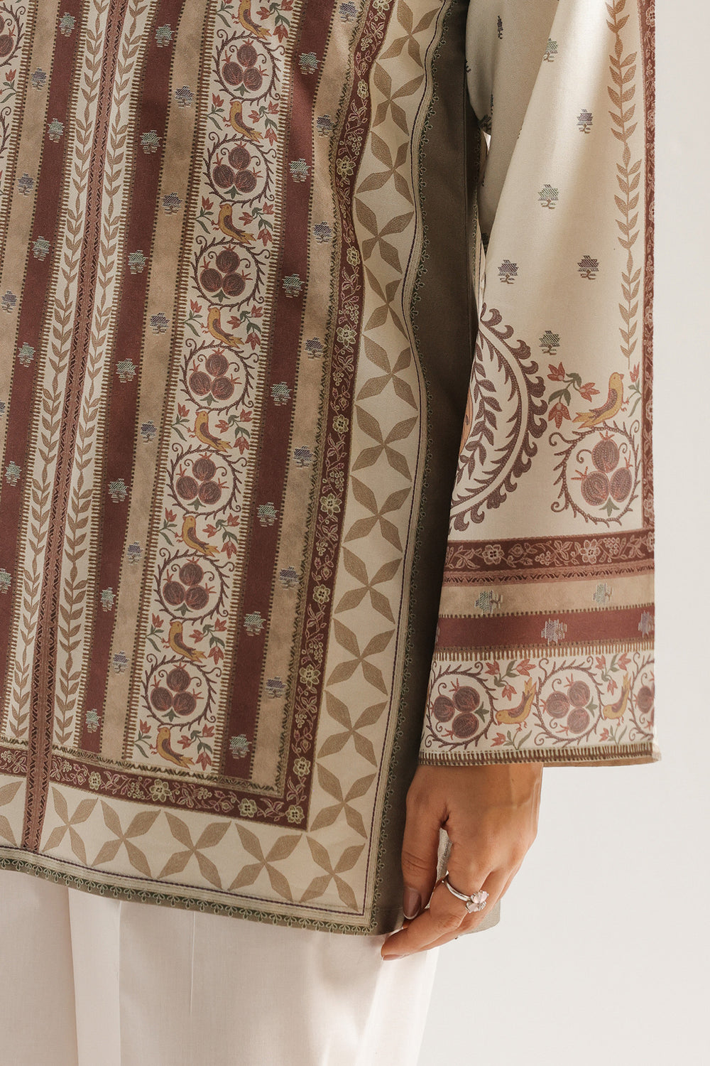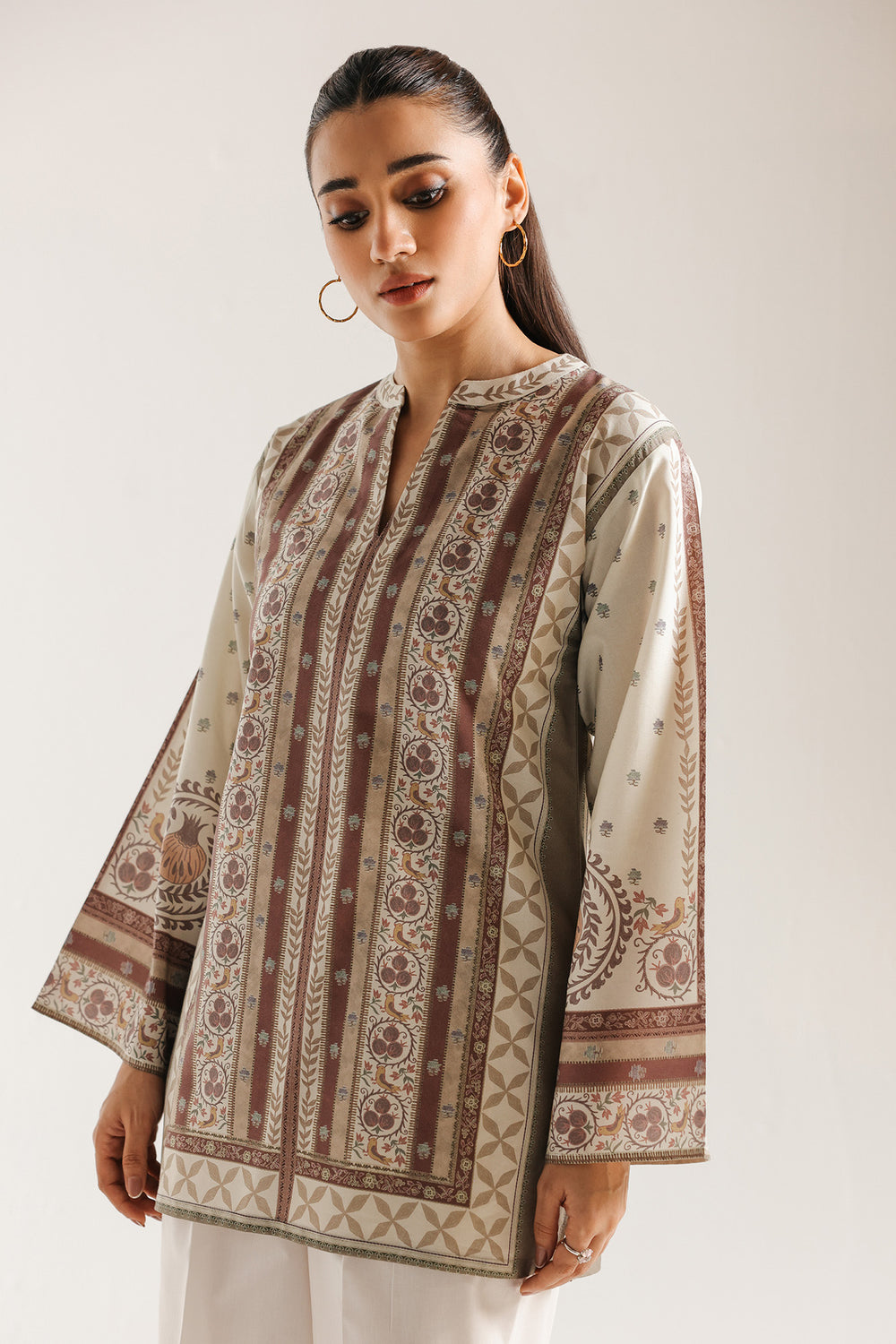 Step into a world of refined elegance with this ivory printed kurti, featuring a structured, straight-cut silhouette. The kurti is defined by its sophisticated earth-toned print, which incorporates vertical stripes of floral vines and geometric patterns in shades of taupe and dusty rose. The wide, flared sleeves feature intricate oversized paisley motifs and a decorative geometric border at the cuffs, mirrored at the hemline. This shirt offers a contemporary yet timeless aesthetic.