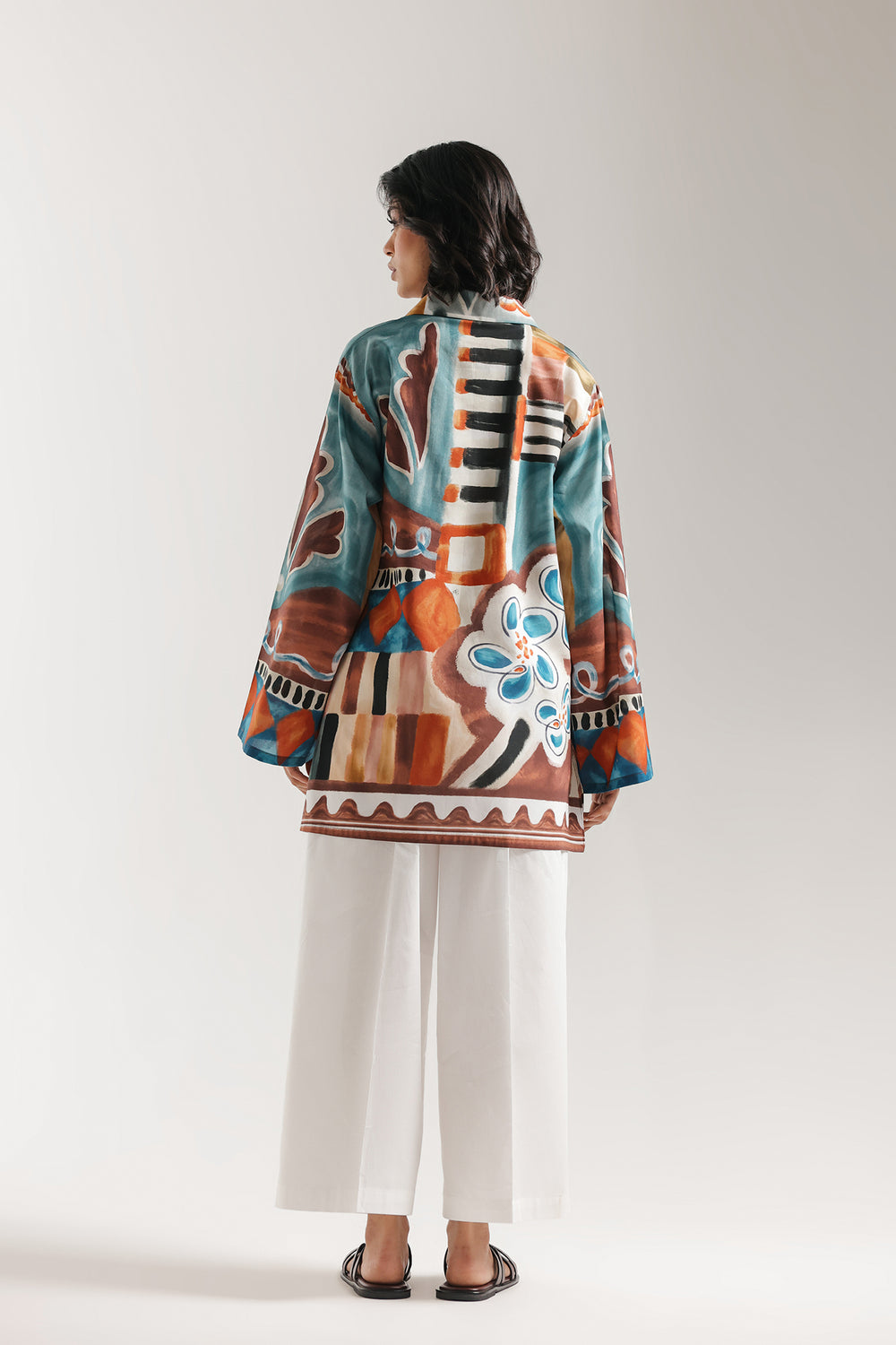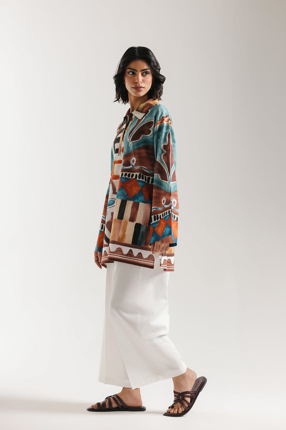 Make a bold artistic statement with this printed kurti, a vibrant fusion of contemporary abstract design and effortless style. The multi-colored canvas features an eclectic mix of teal, rust, and mustard tones, layered with geometric blocks and whimsical hand-painted floral motifs. Its modern silhouette is defined by a structured pointed collar and a relaxed, open neckline, leading into voluminous wide sleeves that offer a touch of dramatic flair. A distinctive wave-patterned border grounds the hemline, adding a refined finish to the fluid drape.