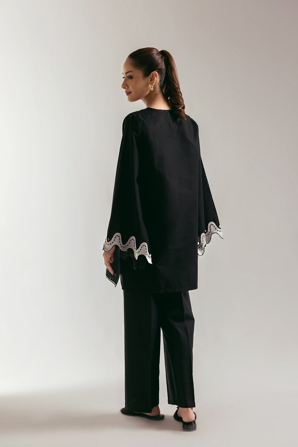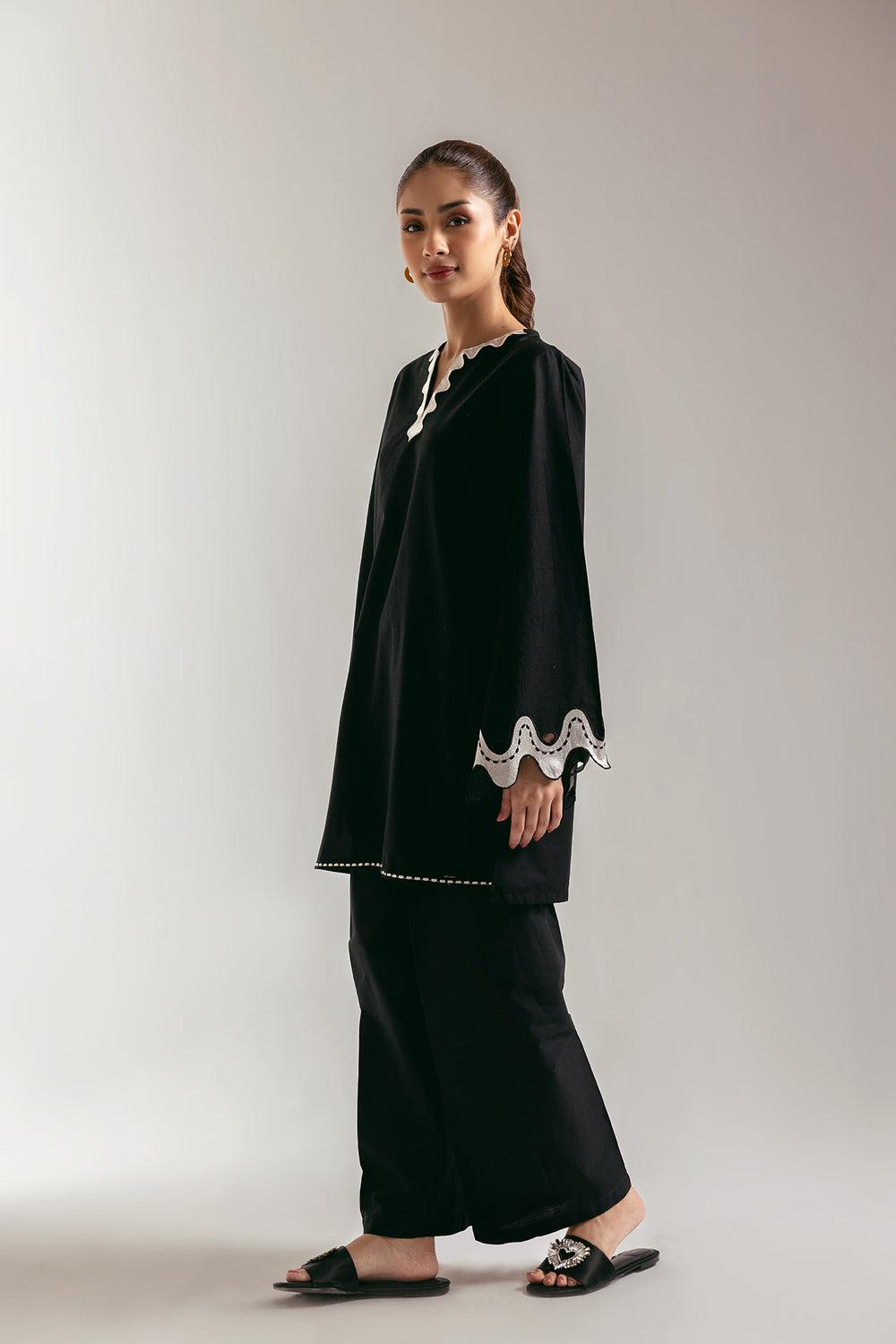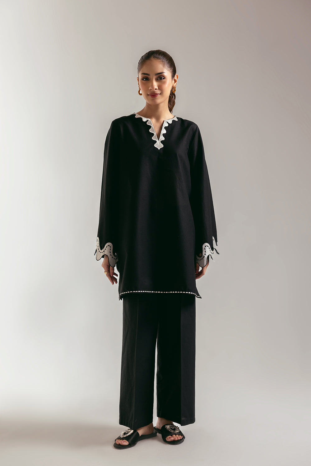 Embrace minimalist elegance with this chic black kurta. The deep black fabric provides a sophisticated backdrop, allowing the delicate white embroidered trim at the V-neckline, cuffs, and hem to truly shine, adding a touch of refined detail. It's a whisper of artistry against a canvas of calm, offering an effortless elegance that speaks volumes in its quiet detail. Drape yourself in comfort and understated beauty.