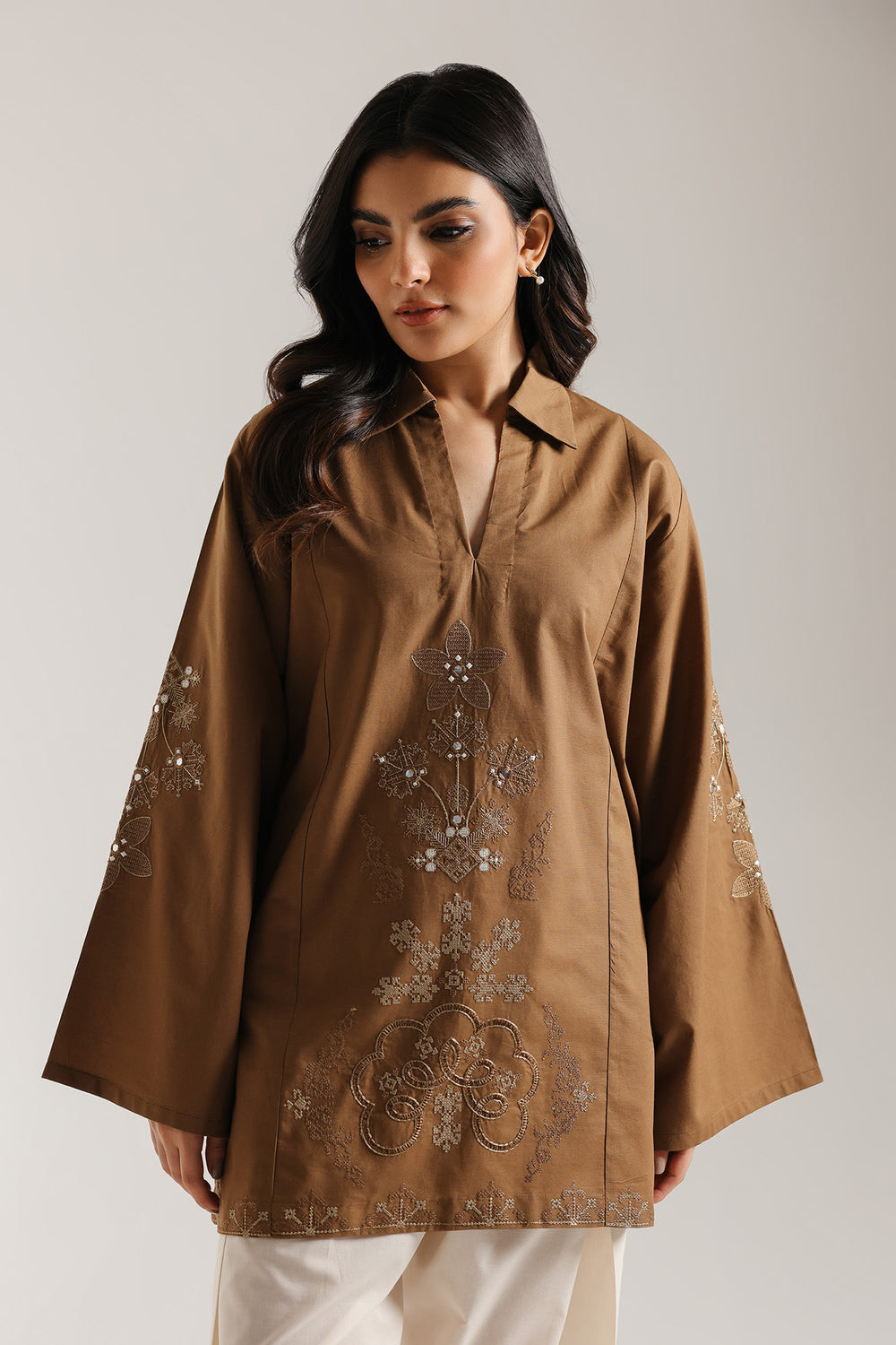 Adorn yourself in subtle, earthy elegance with this beautiful embroidered shirt. This short, straight-cut shirt is rendered in a soft, khaaki fabric. The front is elegantly decorated with detailed brown thread embroidery in ornate floral and geometric patterns. The embroidery is further mirrored on the cuffs of the wide sleeves. It features a classic collar and a V-neckline. This versatile shirt pairs perfectly with solid trousers for a sophisticated monochromatic look.