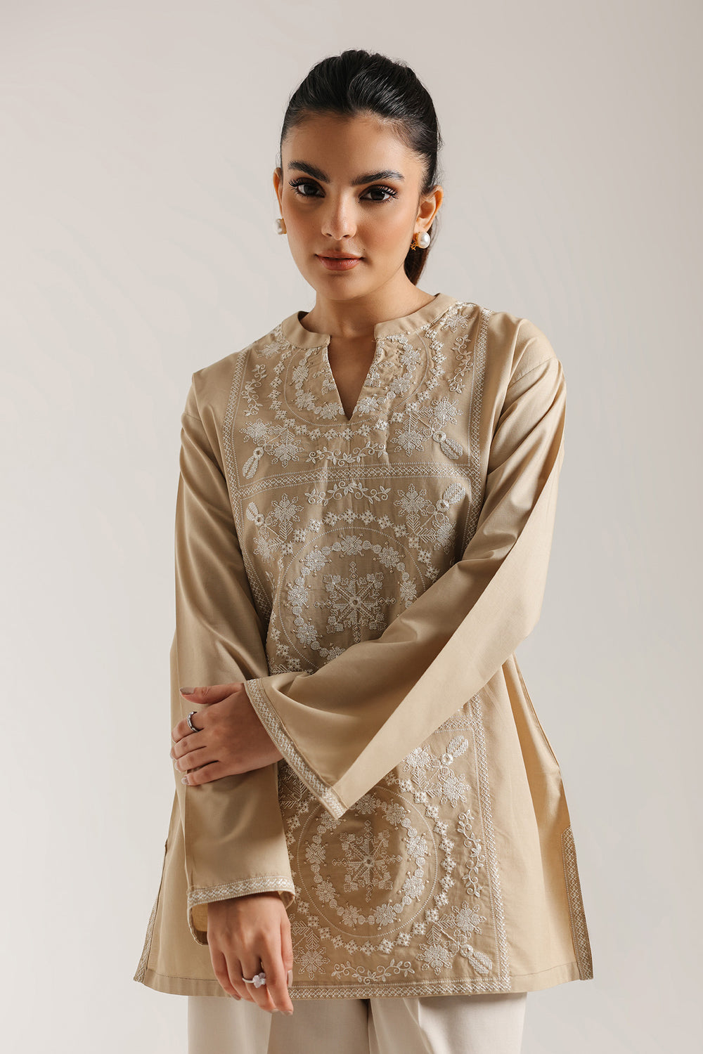 Project timeless sophistication in this chic beige and white embroidered shirt. The front panel is densely covered with striking white embroidery in ornate geometric and circular patterns. It features a flattering V-neckline with a band collar and comfortable, wide sleeves. The monochromatic embroidery against the solid background creates a statement piece that is perfect for pairing with white trousers for a sharp, modern ensemble.