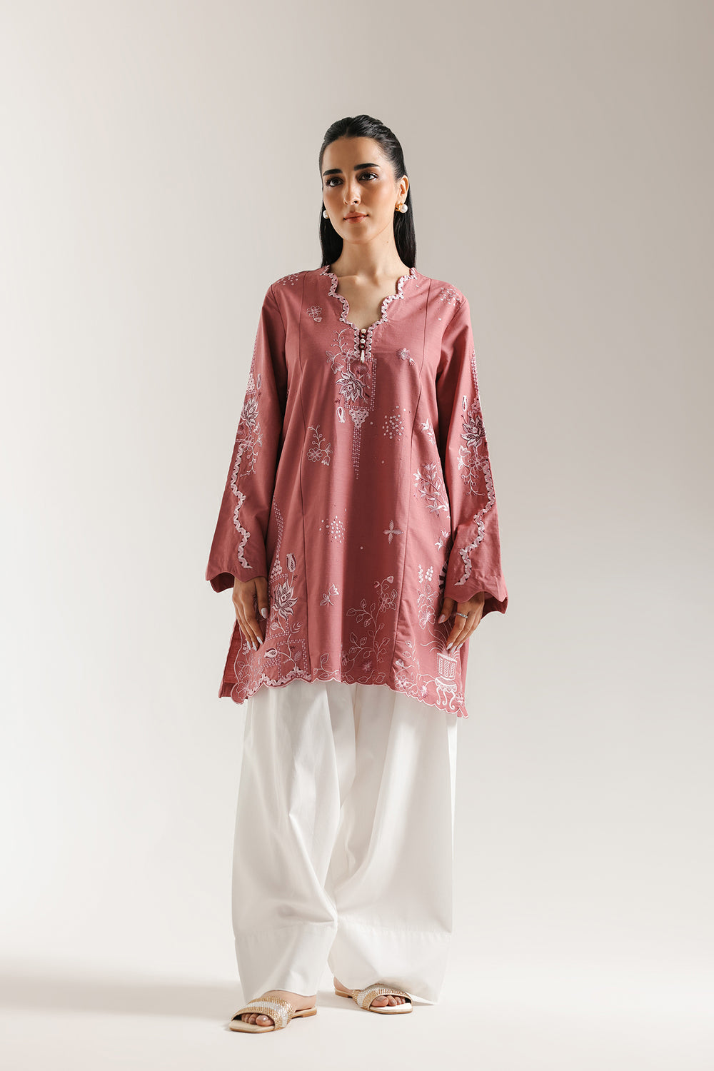 Immerse yourself in romantic, rosy charm with this exquisite dusty pink embroidered Shirt. This short, A line-cut shirt is crafted from a soft, raspberry rose fabric and features beautiful tonal thread embroidery. The intricate floral vine patterns gracefully trail across the front and wide sleeves. The V-slit neckline is accented with delicate button details and the hem is finished with a neat, scalloped cutwork edge.