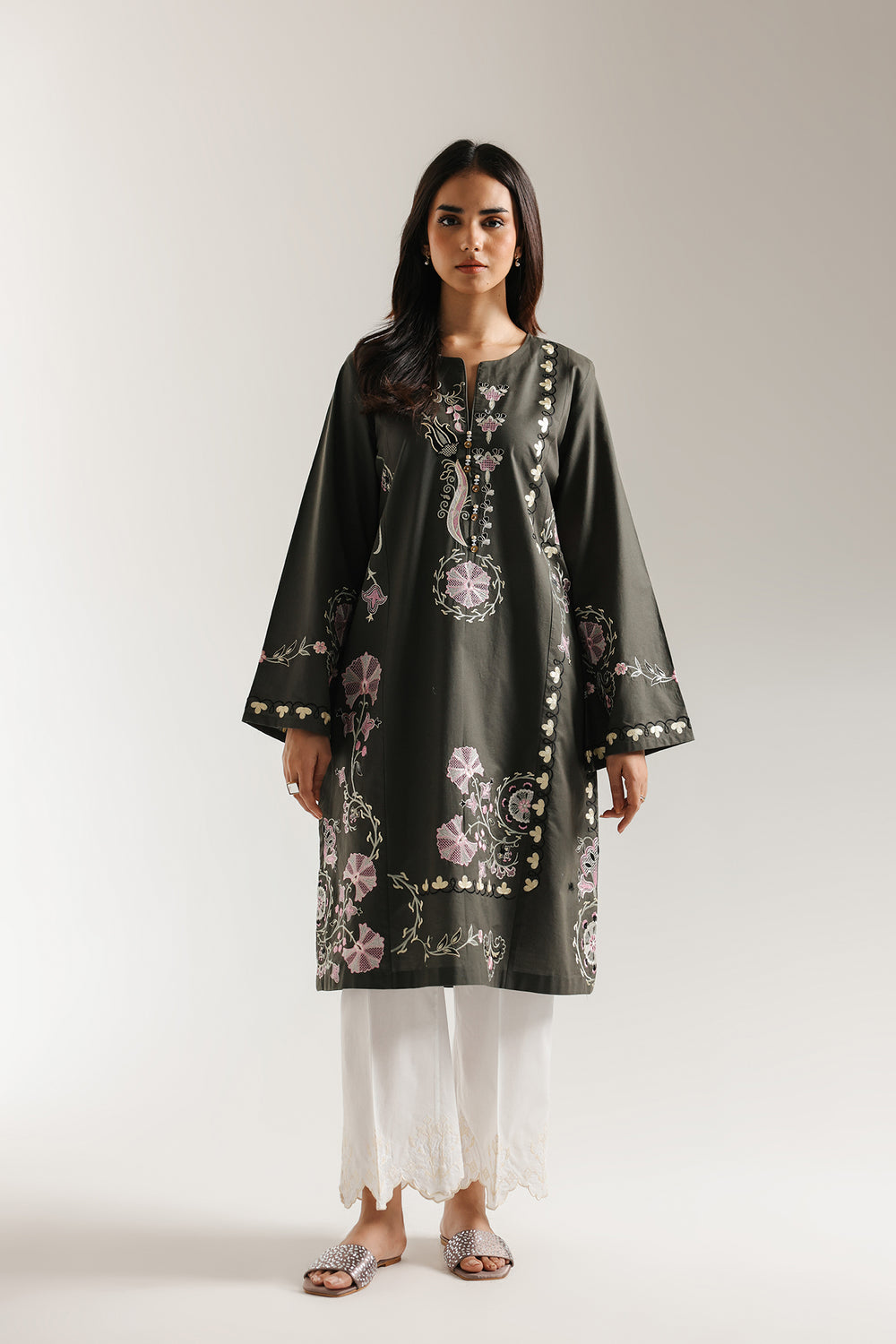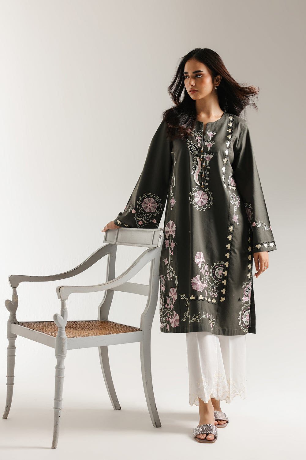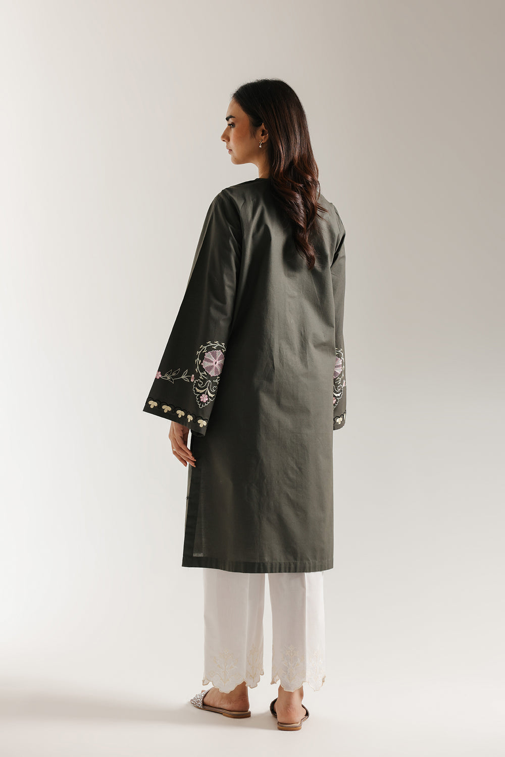 Wrap yourself in this olive-green embroidered shirt. This long, straight-cut shirt is crafted from a deep olive-green fabric. It features beautiful, intricate thread embroidery in delicate pink, mauve, and white floral patterns that elegantly trace the front, hem, and sleeve cuffs. The round neck with slit is accented with subtle button detailing.