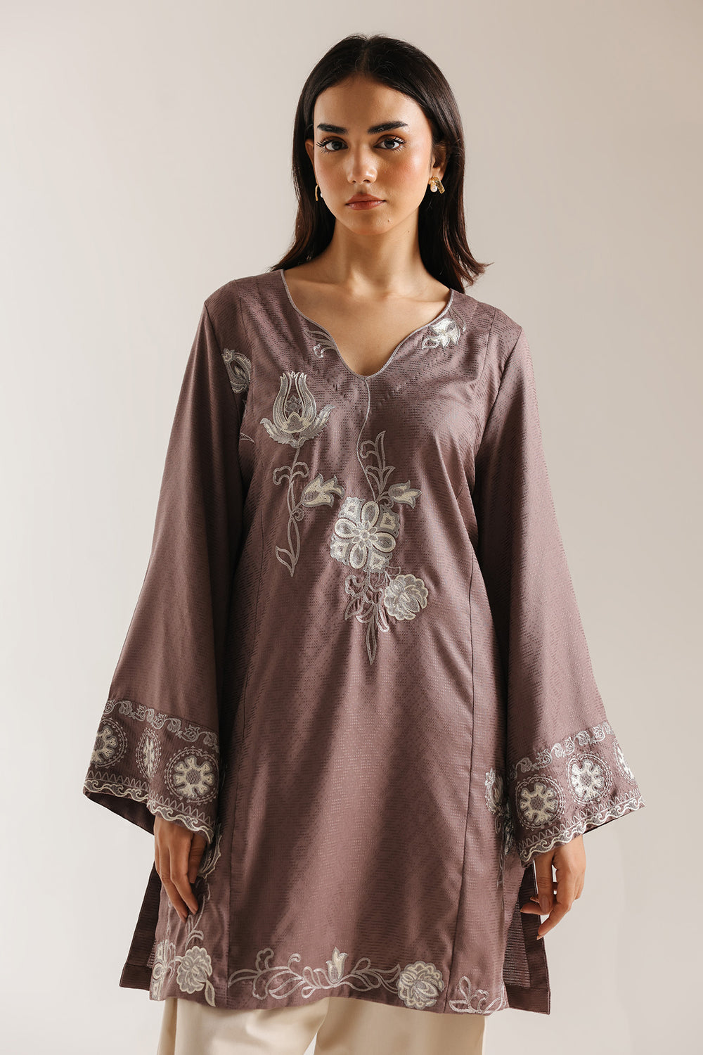 Elevate your wardrobe with this sophisticated embroidered shirt, expertly crafted in a luxurious dusty mauve tone. The tunic features delicate all-over patterning paired with intricate silver and white embroidery detailing along the V-neckline, front placket, and cuff borders. Full-length sleeves with a subtle flared finish at the wrist add graceful movement and contemporary elegance. This versatile piece transitions seamlessly from casual gatherings to formal occasions, offering timeless appeal with modern sensibility.