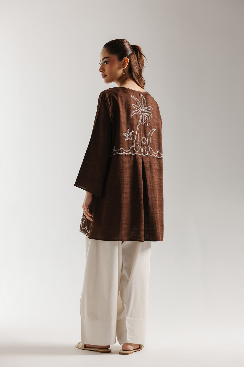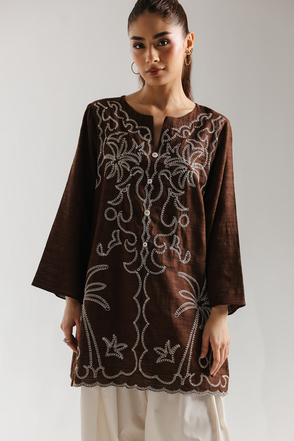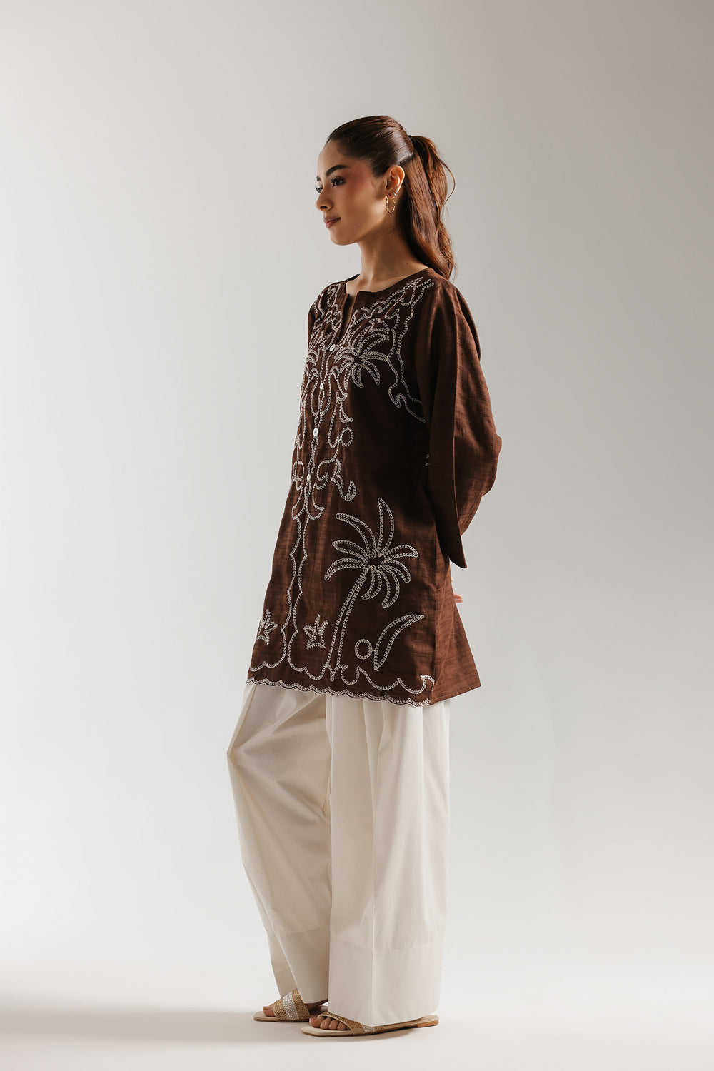 Embrace a warm, grounded aesthetic with this sophisticated tunic, a perfect blend of earthy tones and crisp, high-contrast artistry. The shirt features a refined split neckline accented with delicate white buttons, leading into a bodice dominated by sprawling, symmetrical botanical threadwork. The centrepiece of this design is the whimsical white tropical embroidery, featuring soaring palm trees and swirling vine-like tendrils that create an elegant, fluid texture across the rich canvas. This breezy theme extends to the hemline, which is finished with a dainty white scalloped border for an artisanal touch. With its relaxed silhouette and comfortable three-quarter length sleeves, this tunic offers an effortlessly chic look for elevated casual outings or stylish daytime festivities.