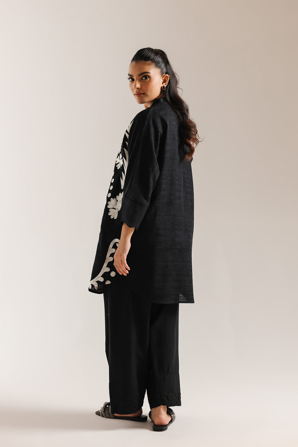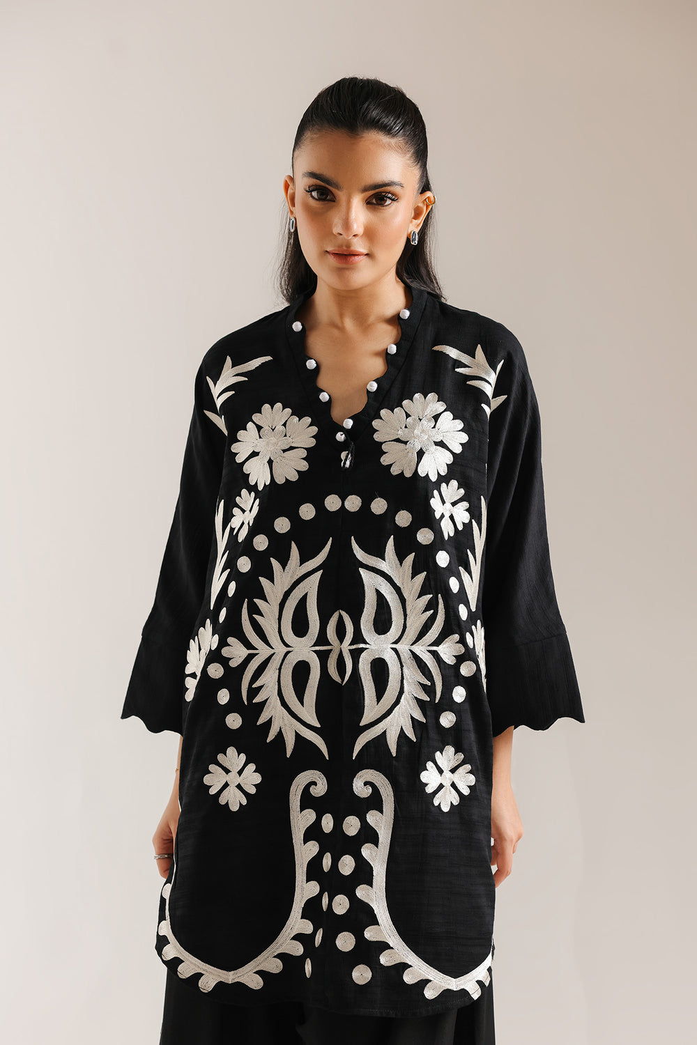 Embrace a striking, high-contrast aesthetic with this sophisticated black tunic, a masterclass in bold monochromatic artistry. The shirt features a modern V neckline, uniquely accented with oversized white pearl-style buttons that provide a luminous touch against the dark fabric. A symmetrical explosion of crisp white embroidery dominates the bodice, featuring large-scale botanical leaves and blooming floral motifs that create a powerful visual impact.