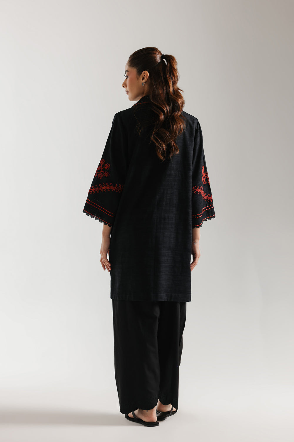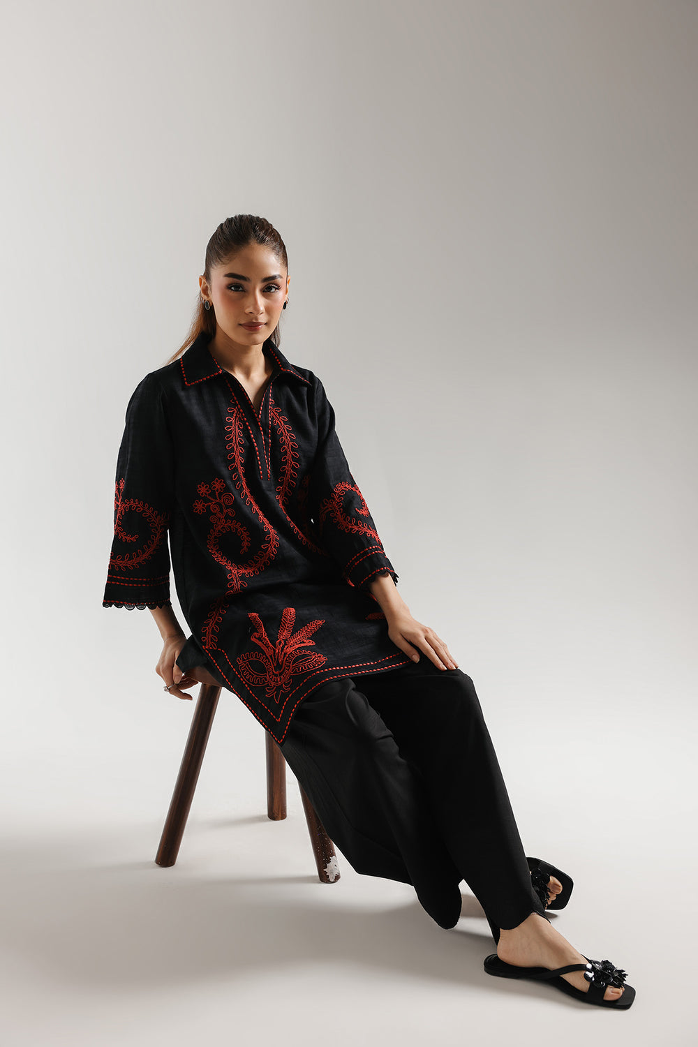 Stay bold and sophisticated in this striking black tunic, featuring vibrant rust-red embroidery that creates a powerful high-contrast look. The shirt is designed with a classic pointed collar and a deep V-neckline, framed by intricate, scrolling threadwork that extends across the bodice and sleeves. Detailed botanical motifs at the hem add an extra layer of artistry to the sleek, straight silhouette, while the delicate lace edging on the sleeves provides a feminine touch. This piece is a perfect fusion of traditional craftsmanship and modern tailoring, making it a standout choice for an elevated everyday ensemble.