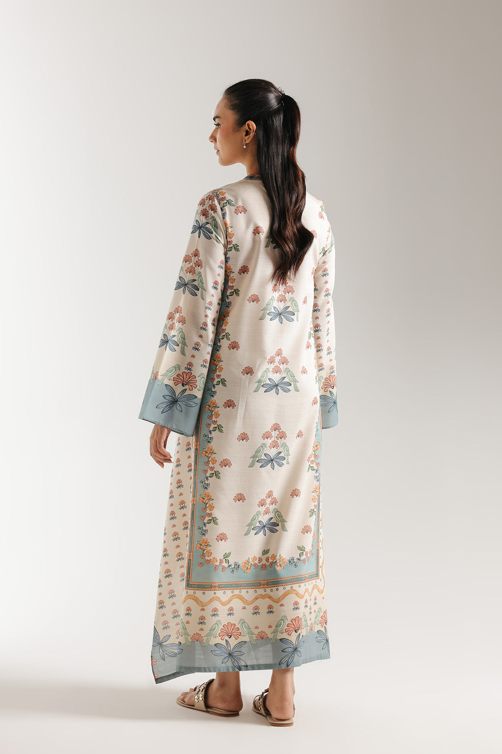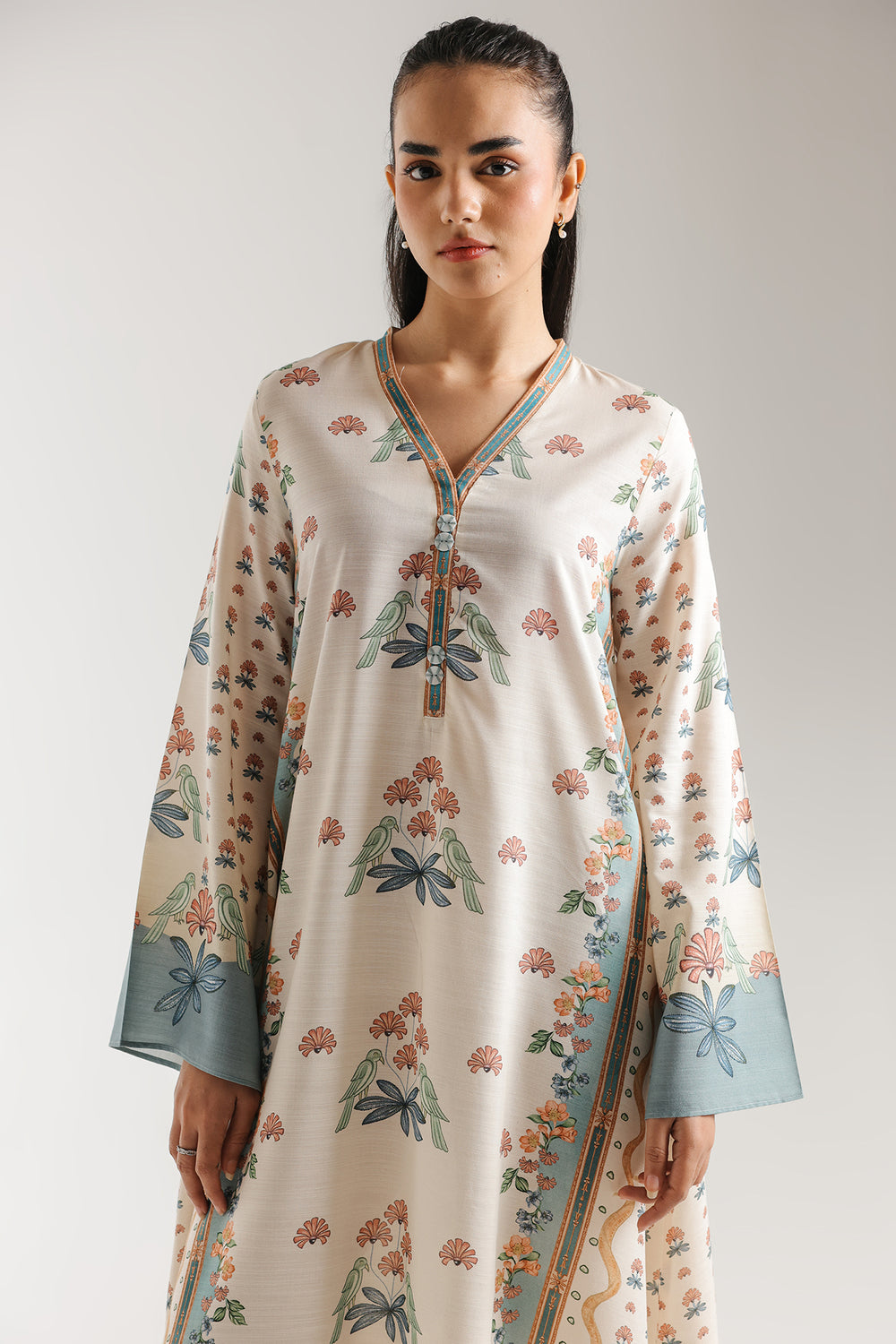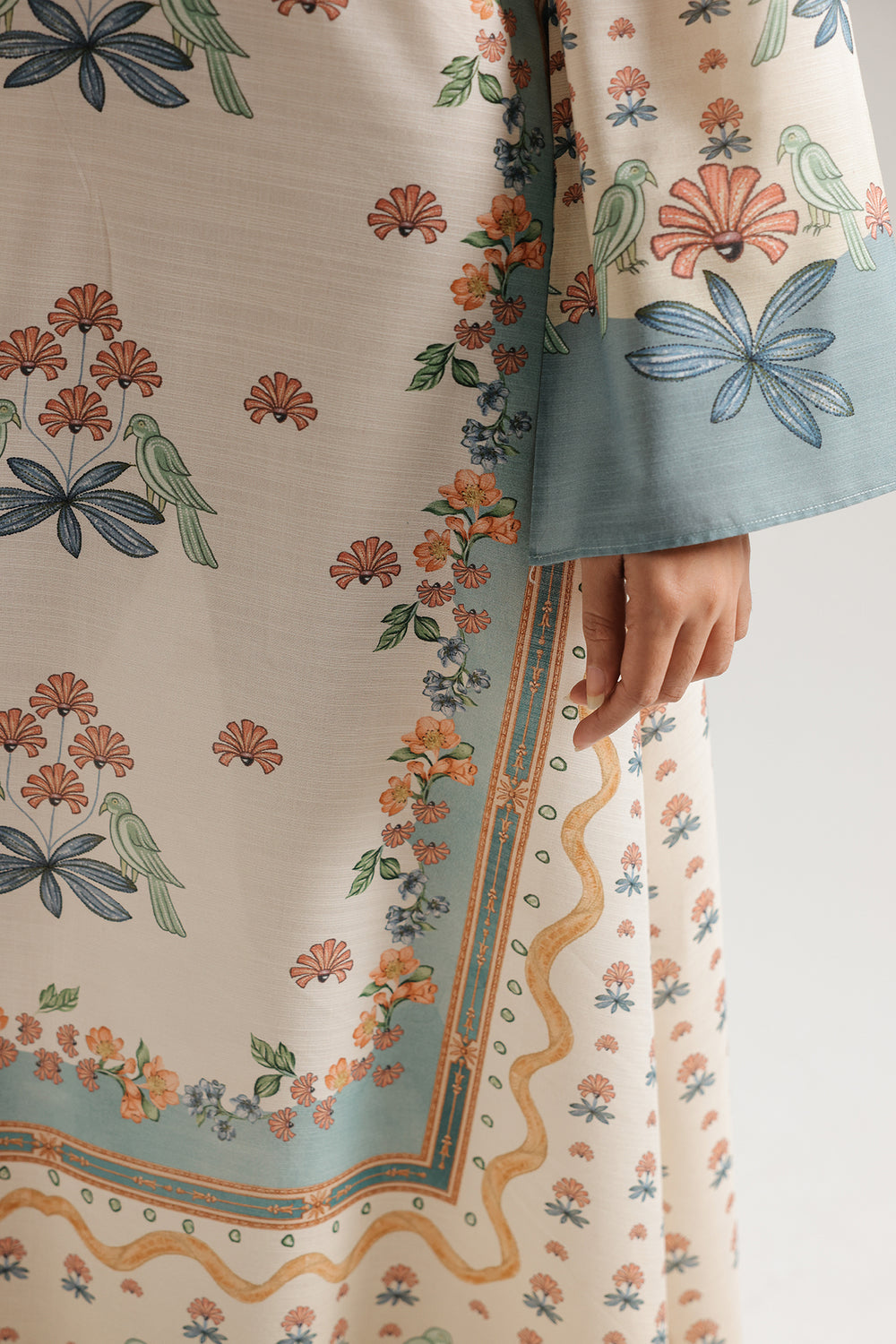 Exude an air of effortless charm with this ivory one-piece printed dress, featuring a soft and whimsical botanical aesthetic. The design is adorned with a delicate all-over print of peach-toned floral clusters and sage green bird motifs, framed by elegant teal borders at the sleeves and hemline. A refined V-neckline with a dainty button-down placket adds a structured touch, while the long, flowing silhouette creates a graceful and airy drape. Finished with wide flared sleeves and a handkerchief-style asymmetrical hem, this dress is a perfect choice for a fresh and feminine daytime look.