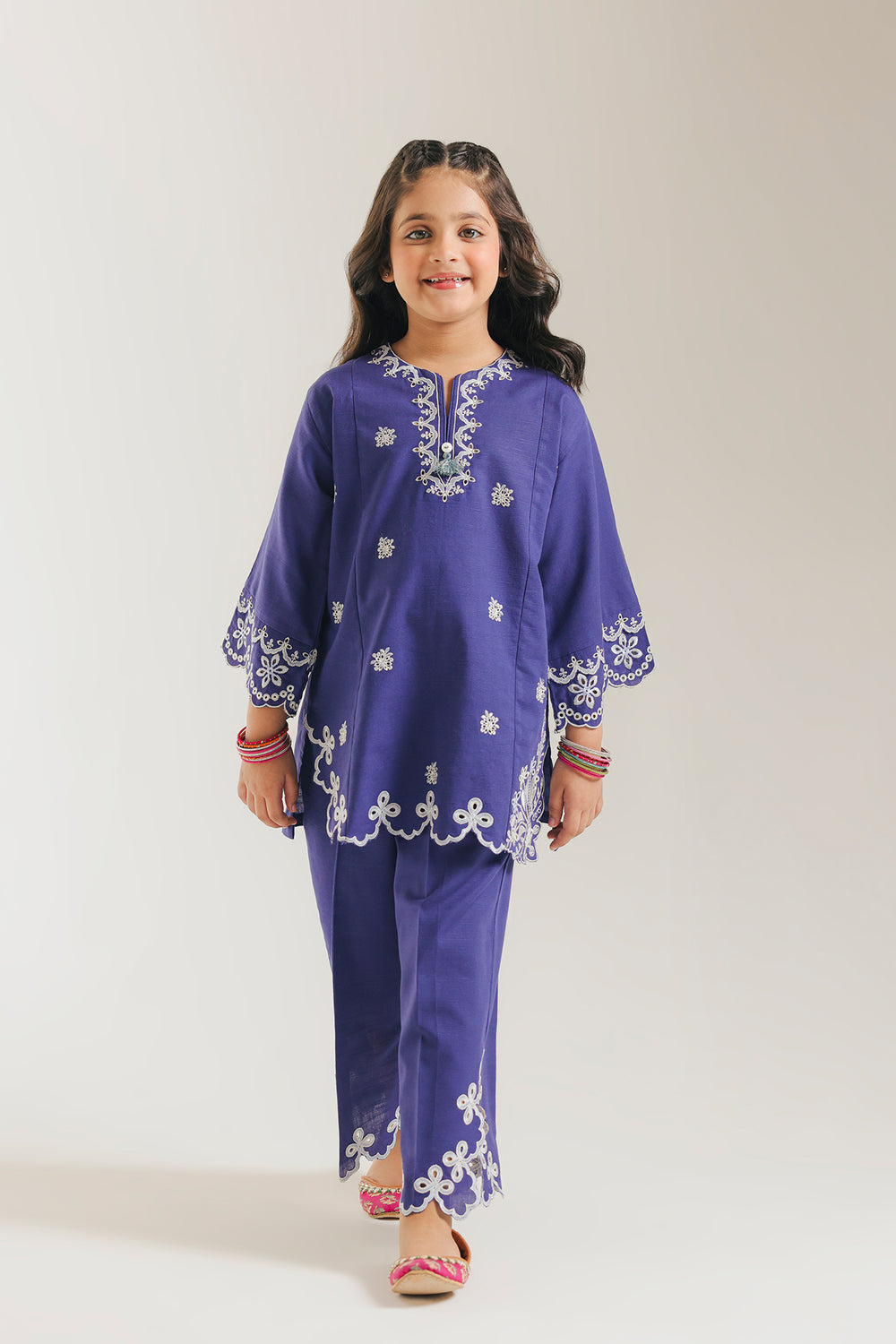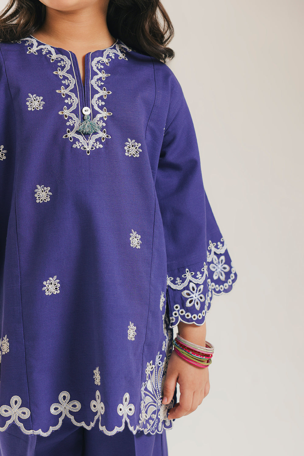 Bring a pop of color to your little one's wardrobe with this striking blue embroidered suit. The straight-cut kurti is rendered in a vibrant royal blue fabric and features a comfortable slit-neckline. It is beautifully accented with bold white cutwork and thread embroidery, detailing the neckline, waist, cuffs of the flared sleeves, and hemline. The coordinating straight trousers feature matching cutwork embroidery at the hem, completing this perfectly matched and festive look.