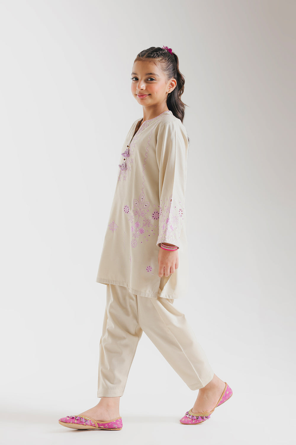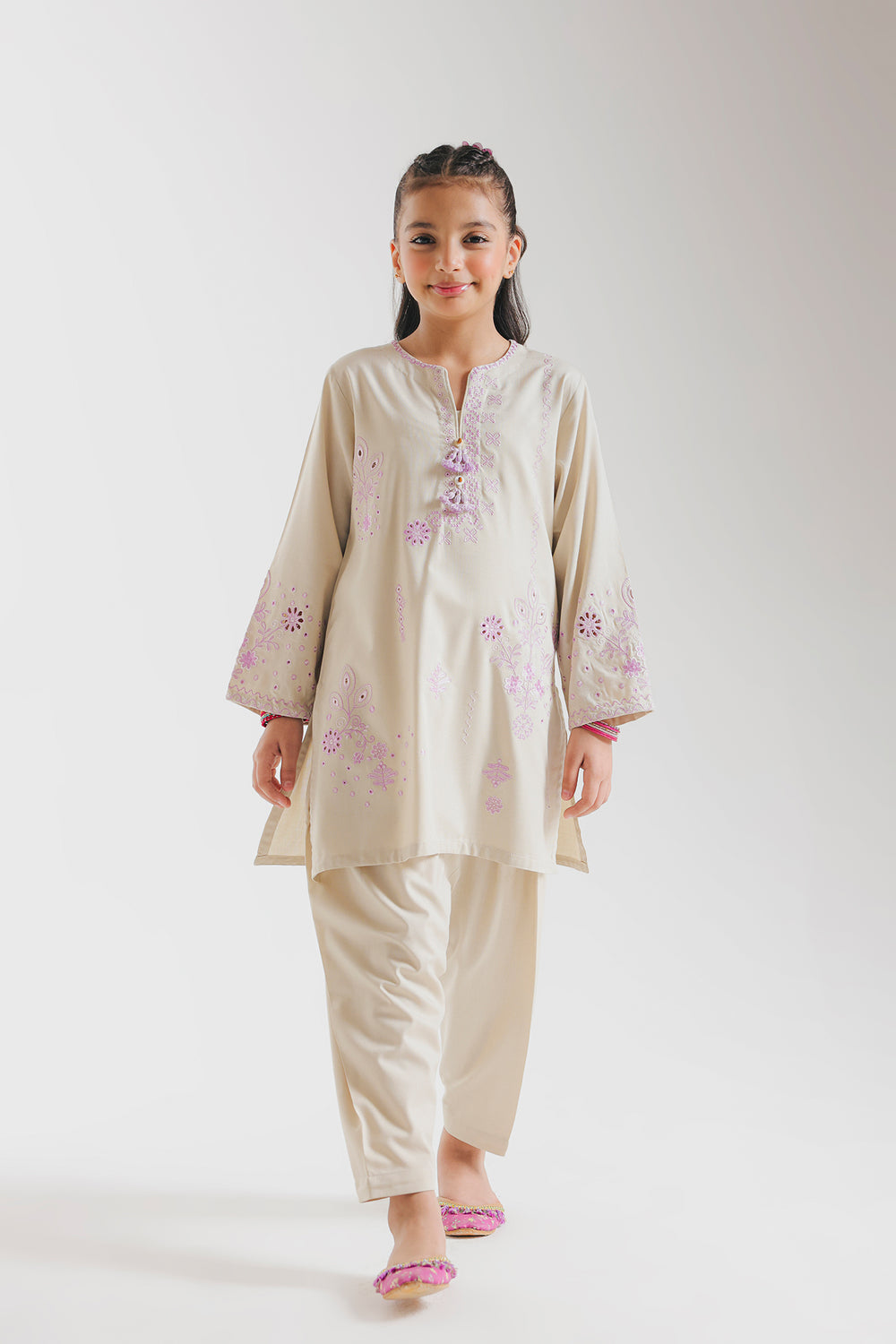 The shirt features delicate embroidered floral motifs in shades of purple adding a touch of festive vibrance. It has a straight, comfortable silhouette with full sleeves and a simple round neckline adorned with embroidery detailing. The matching trousers are loose-fitted for ease and style, creating a graceful yet playful look. Paired with green traditional shoes, the ensemble perfectly balances elegance and youthful charm, ideal for festive gatherings or cultural celebrations.