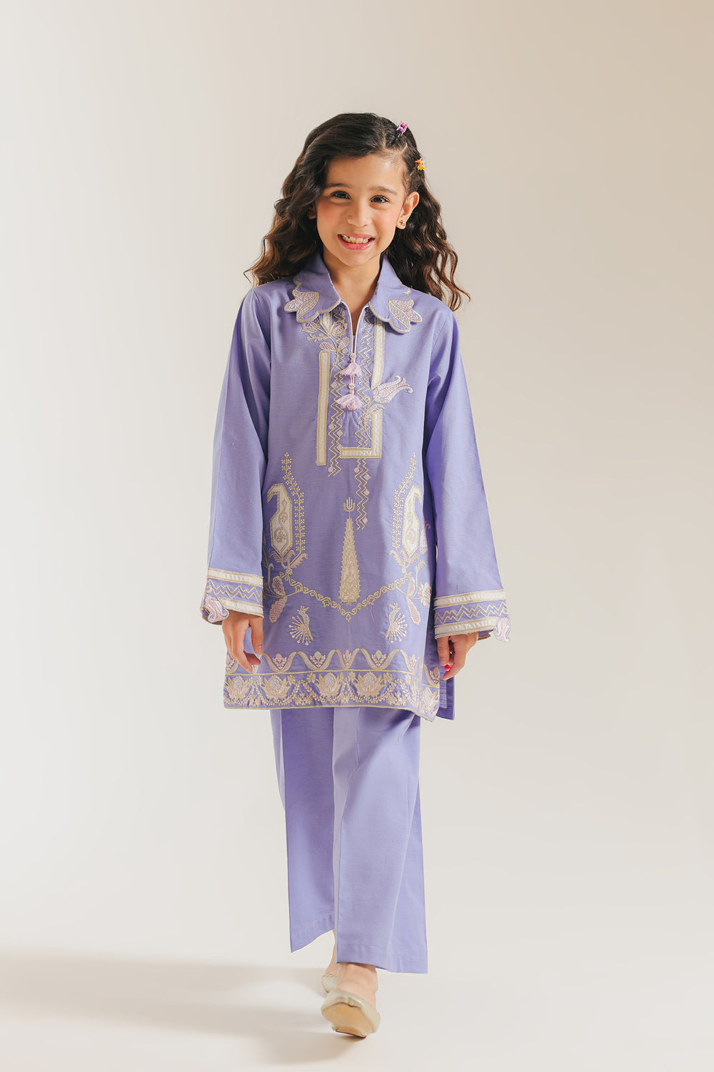 Elevate your child's wardrobe with this sophisticated denim blue ensemble. The shirt features a classic collar neck and refined white embroidery detailing on the front and sleeves, adding an elegant touch to everyday wear. Paired with a straight-fit pair of trousers, this coordinated set delivers a polished, put-together look that transitions seamlessly from school to special occasions. Crafted for comfort and style, this embroidered suit combines quality construction with timeless design, ensuring your child looks impeccable while enjoying unrestricted movement throughout the day.