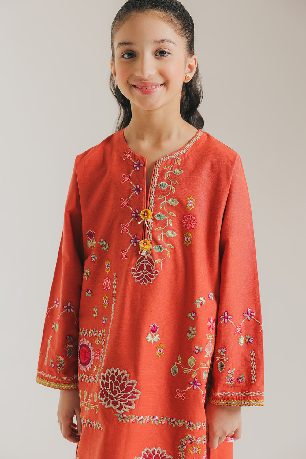The shirt features delicate embroidered floral motifs in shades of pink, green, and yellow, adding a touch of festive vibrance. It has a straight, comfortable silhouette with full sleeves and a simple round neckline adorned with embroidery detailing. The matching trousers are loose-fitted for ease and style, creating a graceful yet playful look. Paired with green traditional shoes, the ensemble perfectly balances elegance and youthful charm, ideal for festive gatherings or cultural celebrations.