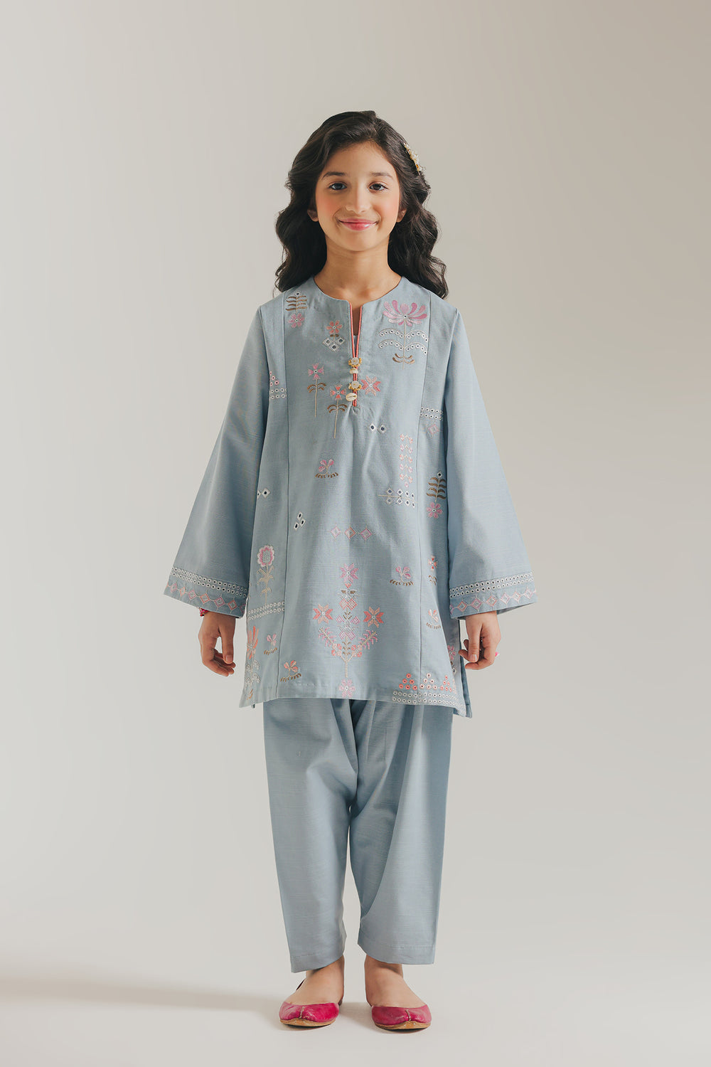 Introduce your child to timeless elegance with this aqua sky embroidered suit, expertly crafted for comfort and style. Featuring intricate embroidery detailing throughout, the suit showcases a classic round neckline paired with a practical slit design for ease of movement. The soft, breathable fabric ensures all-day comfort, making it ideal for celebrations, family gatherings, or special occasions. The sophisticated color palette and refined embroidery work reflect quality craftsmanship, while the thoughtful construction allows children to play and move freely. A versatile wardrobe essential that combines traditional aesthetics with modern practicality.
