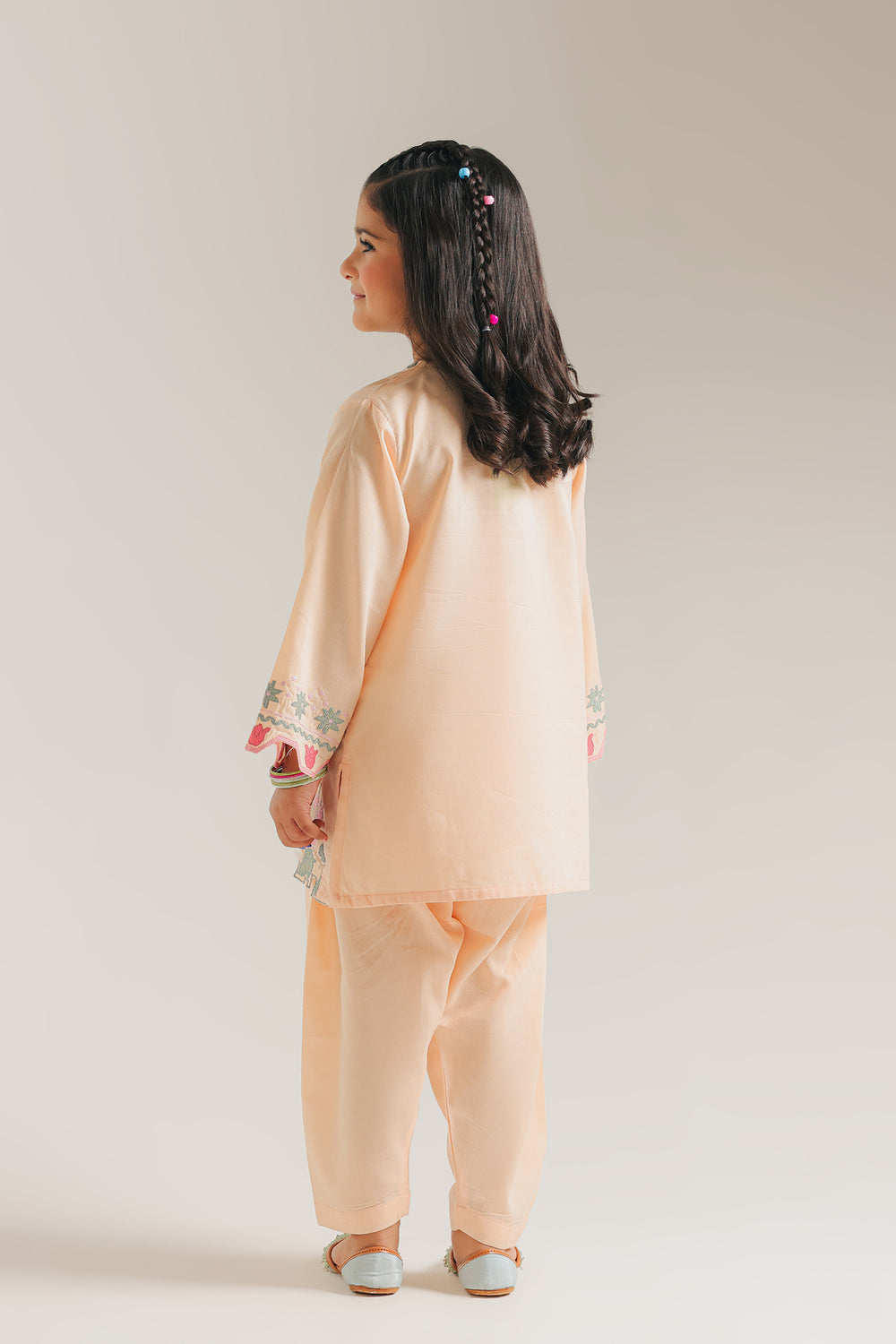 Embrace a soft and cheerful look for her with this lovely pale orange two-piece suit, designed to offer both elegance and comfort. The shirt features a clean silhouette highlighted by delicate pink floral embroidery and teal accents that run along the placket and the flared sleeves. A beautiful scalloped laser-cut finish at the sleeve cuffs adds a modern, dainty touch to the ensemble. Paired with matching pale orange shalwar in a relaxed fit, this set is an ideal choice for daytime festivities or family gatherings where she wants to feel light and festive.