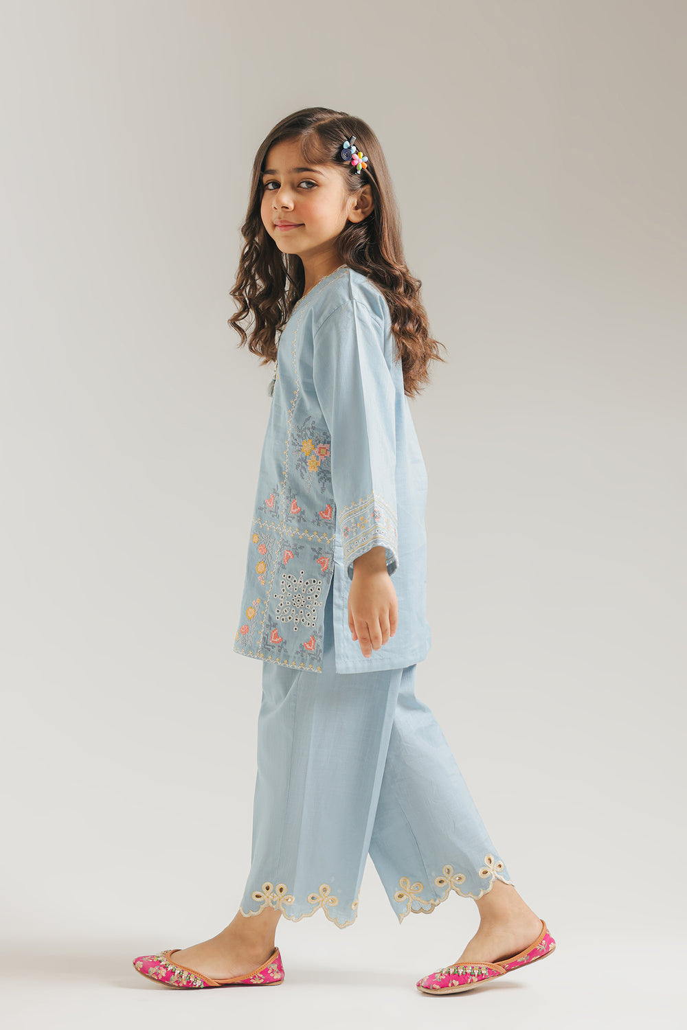 This enchanting sky-blue ensemble for girls is a breath of fresh air, artfully combining a soft pastel palette with intricate artisanal details. The long-sleeved tunic features a serene azure canvas meticulously adorned with delicate floral embroidery in shades of coral and buttercup yellow, centered by a striking white lace-like medallion motif on the bodice. . Paired with coordinating sky-blue trousers that boast matching scalloped embroidery at the hem, this suit offers a cohesive and polished look that is both comfortably breathable and timelessly sweet.