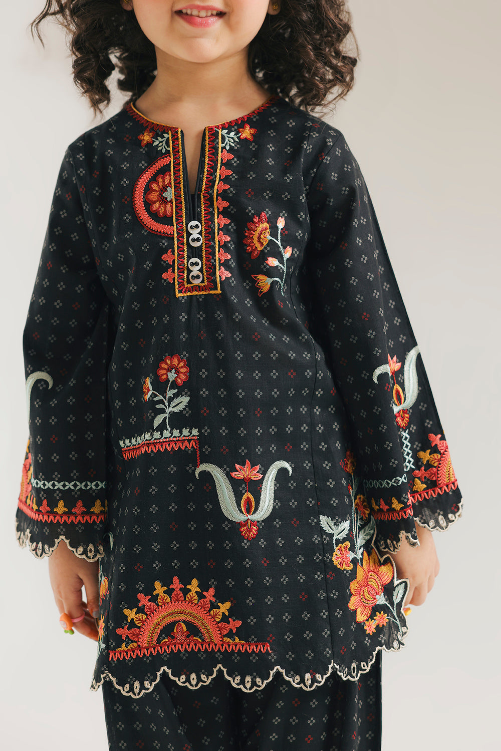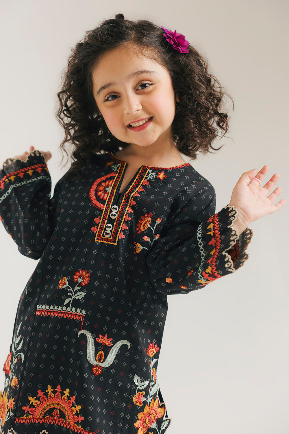 Make a whimsical yet bold statement with this two-piece black embroidered suit, perfect for festive youth wear. The dark fabric is brought to life with vibrant, sun-and-floral inspired embroidery in warm oranges and reds, accented by a delicate scalloped hemline. Paired with matching patterned shalwar, this ensemble beautifully balances traditional craftsmanship with playful, modern charm.