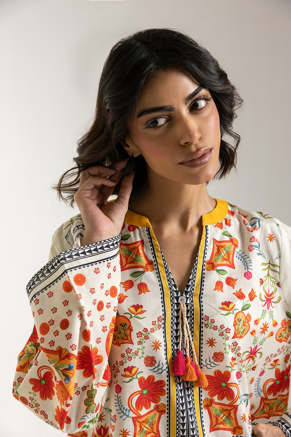 Bring a level of vibrancy to your wardrobe with this strikingly bold and playful ensemble that’s made to turn heads. The ivory kurta bursts with energetic floral and paisley motifs in radiant hues of orange, red, and mustard, balanced by intricate tassel accents that adds a touch of whimsy. Paired with wide-legged, turquoise trousers featuring matching folkloric patterns, this outfit creates a kaleidoscope of color and cultural richness. The geometric borders and rhythmic print placement give it a structured yet expressive appeal.