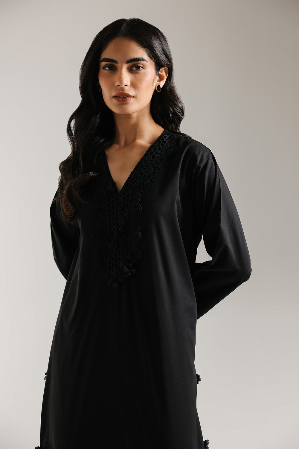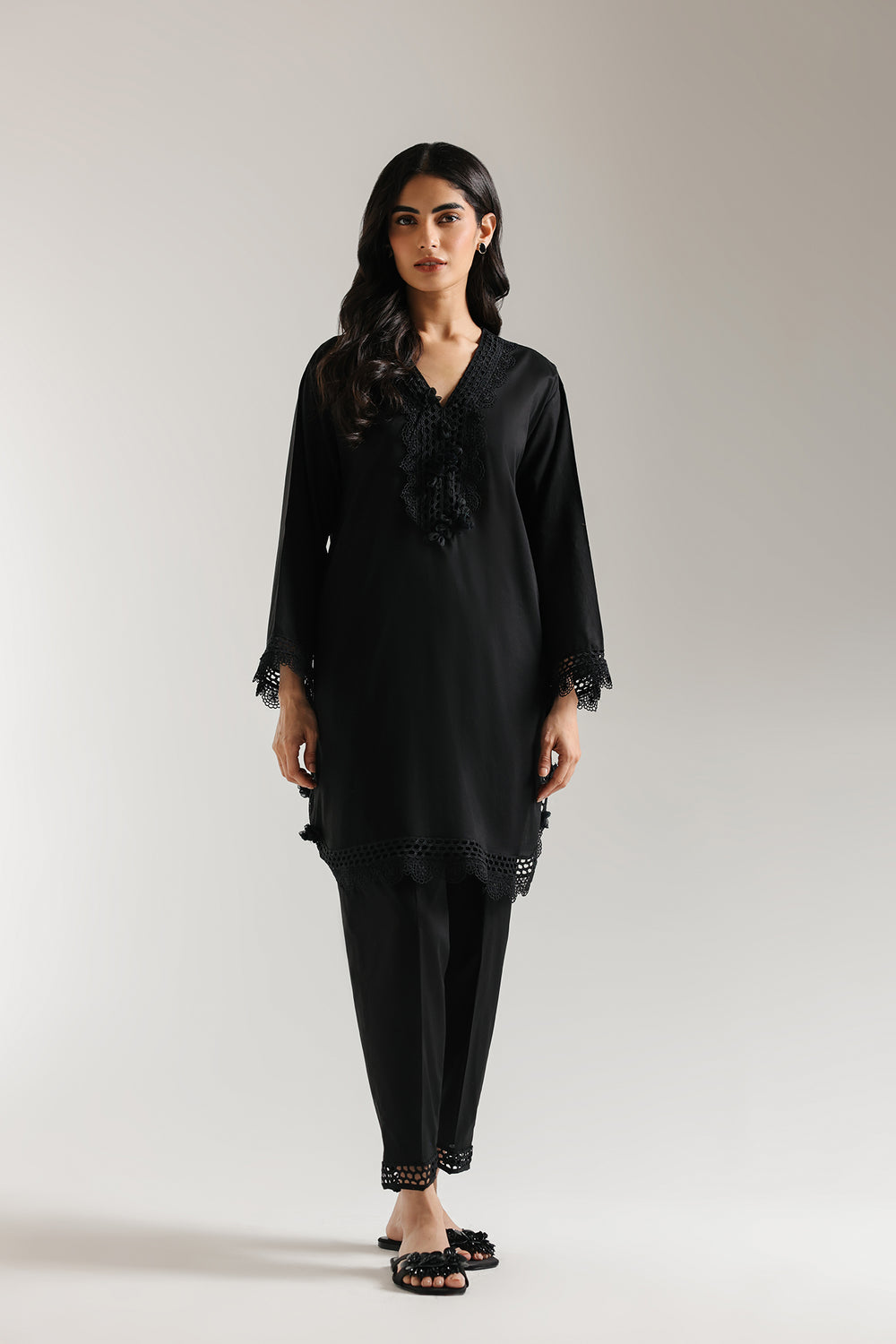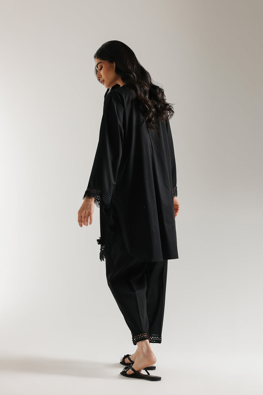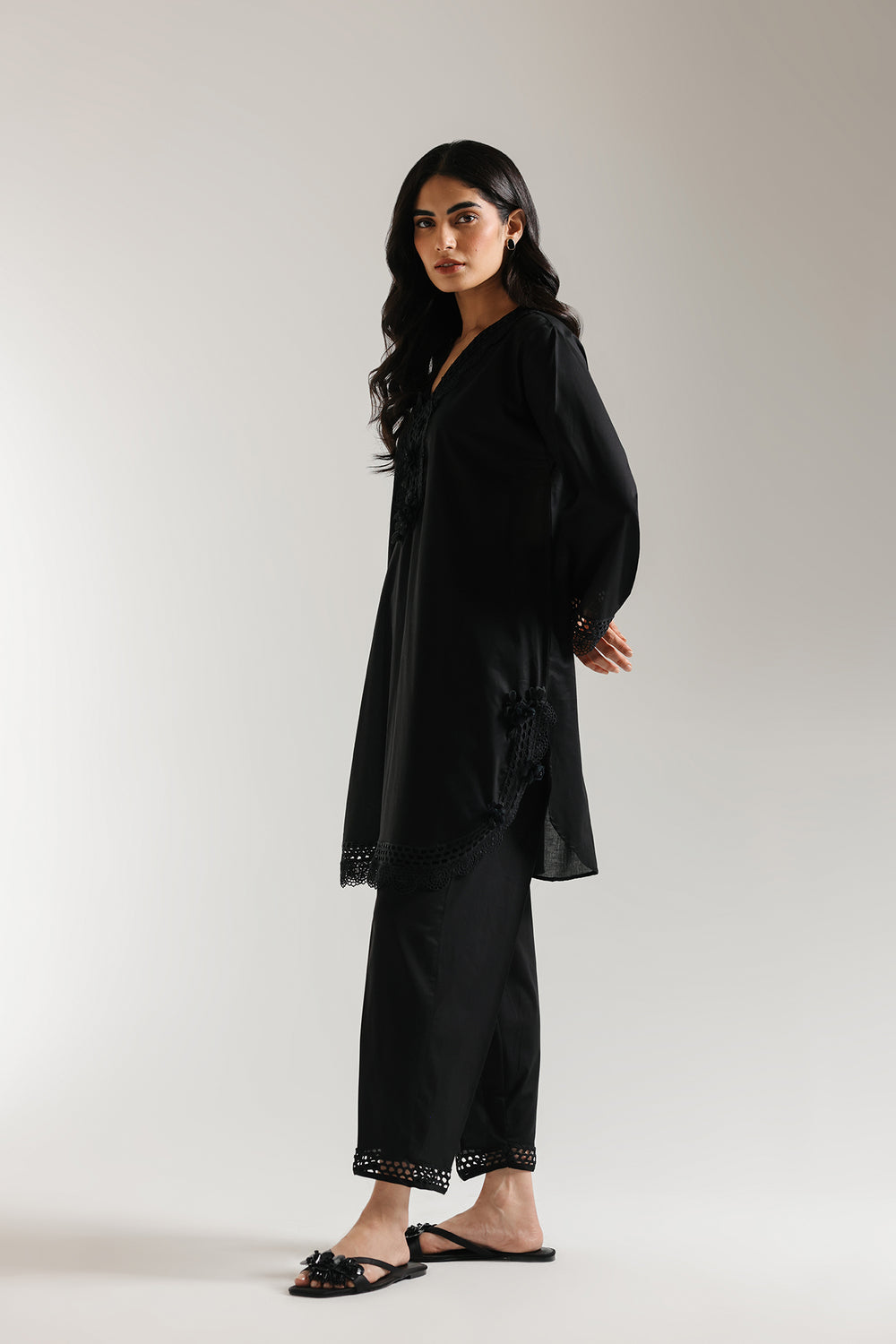 Redefine sophistication with our timeless black kurta, a testament to understated luxury. Crafted with exquisite lace and subtle cutwork details along the neckline and sleeves, this piece offers a chic and versatile option for any occasion. Paired with matching trousers, it exudes an aura of classic elegance that is always in vogue.
