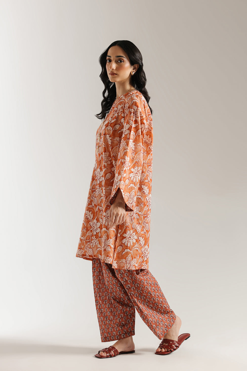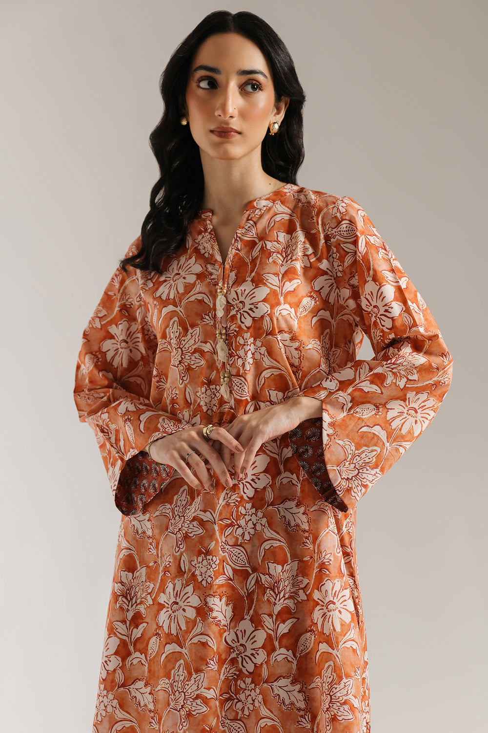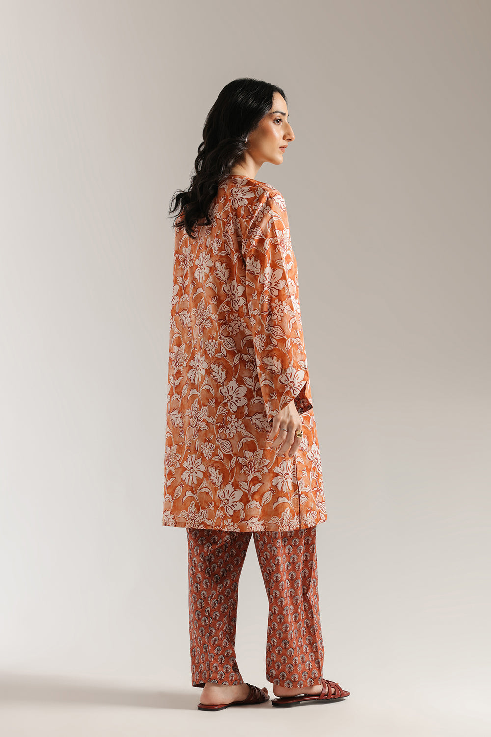 Bask in the warmth of artistic elegance with this stunning printed suit. The rich, terracotta hue serves as a beautiful canvas for a captivating floral and vine pattern in crisp white, creating a look that is both earthy and sophisticated. The contrasting print on the shalwar adds a playful, modern touch, perfectly complementing the traditional silhouette of the kurta. This ensemble is a celebration of vibrant color and intricate design, ideal for making a stylish statement.