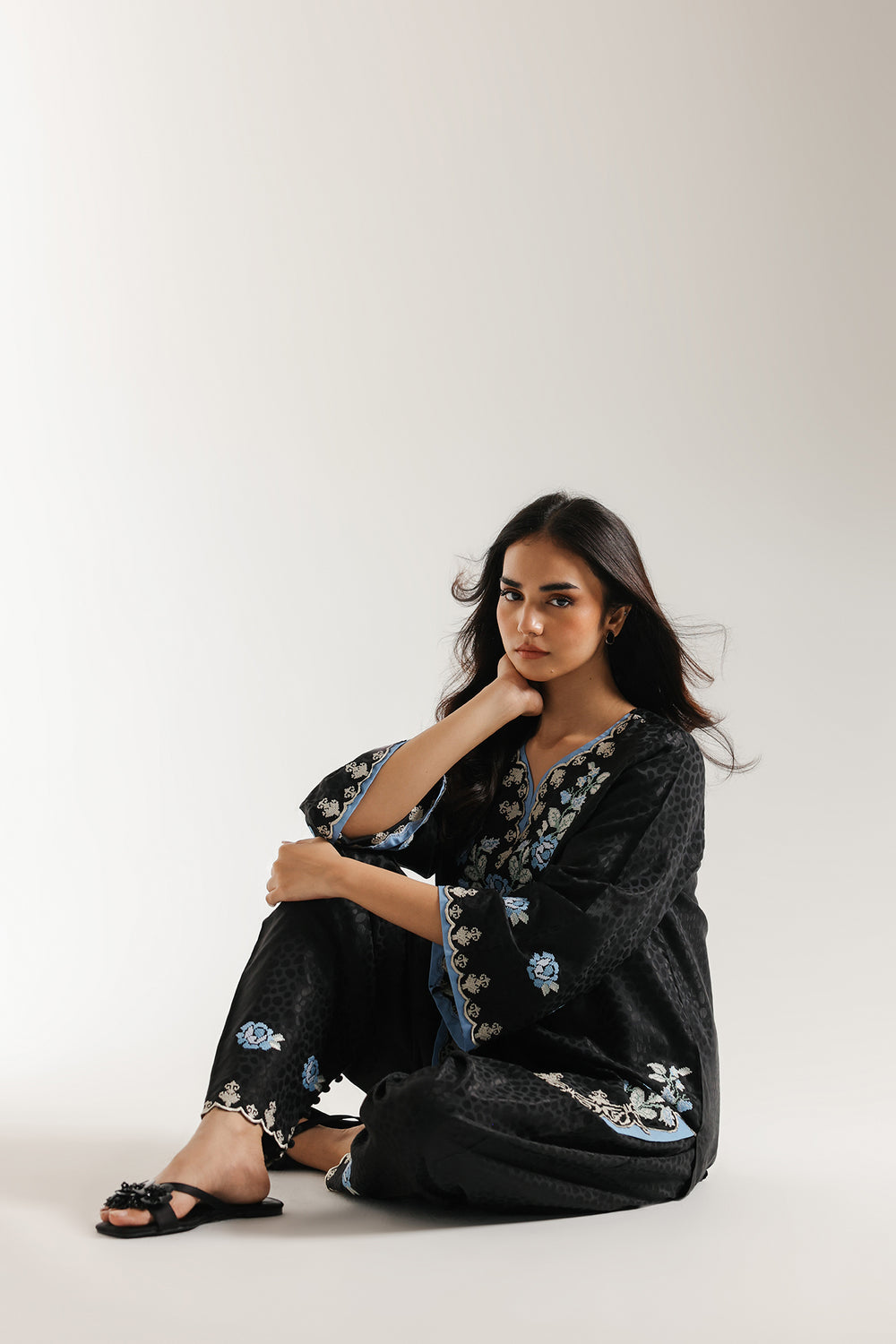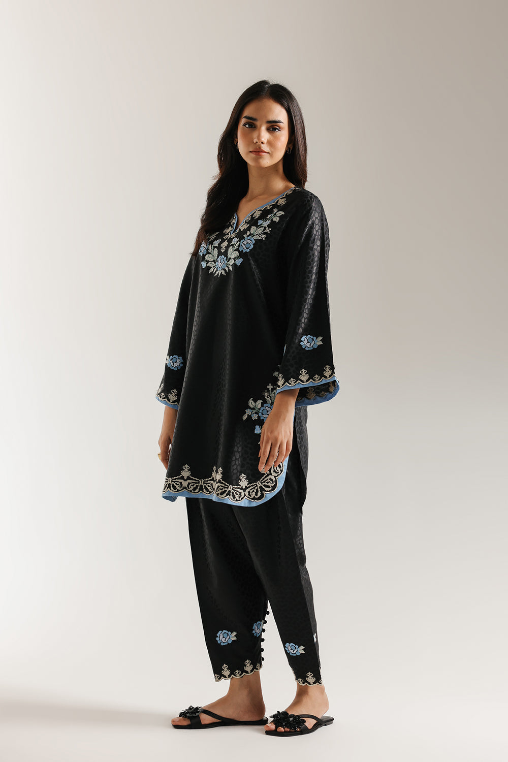 Make a bold and elegant statement with this dramatic black embroidered suit. The short, relaxed-fit kurta is crafted from a deep black fabric that features a subtle tonal all-over print. The shirt is richly detailed with striking floral thread embroidery in shades of light blue and white. The V-neckline is intricately decorated, and the hemline and cuffs are finished with an elegant blue trim. The ensemble is completed by coordinating shalwar in the same black fabric, which feature matching blue and white floral embroidery at the hem, creating a perfectly cohesive and striking traditional look.