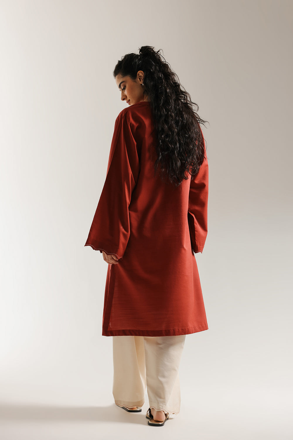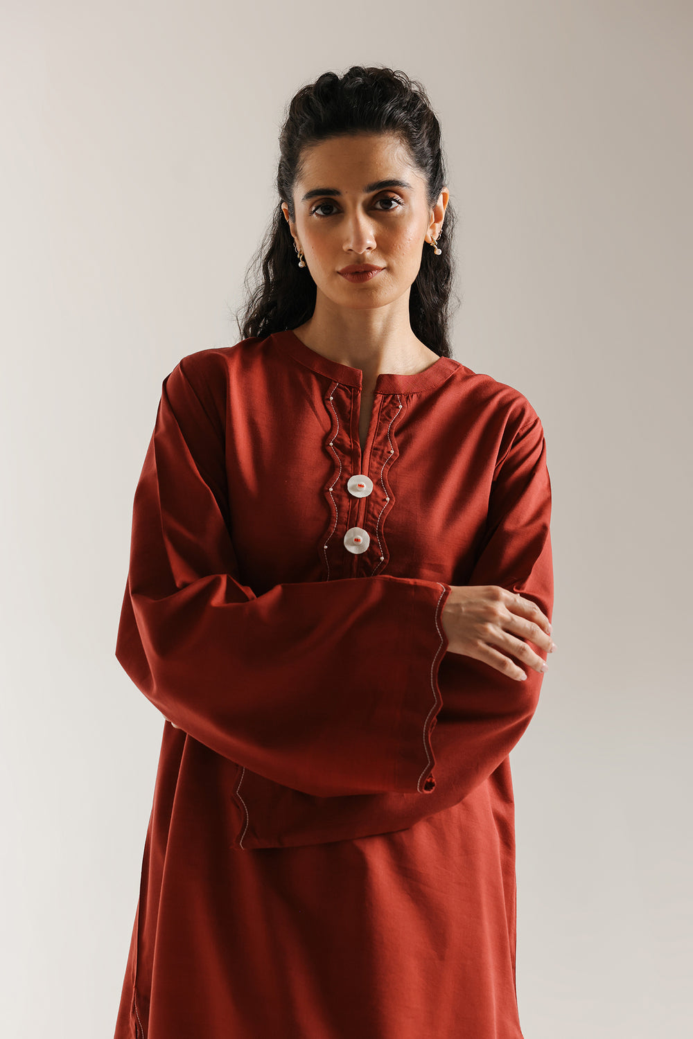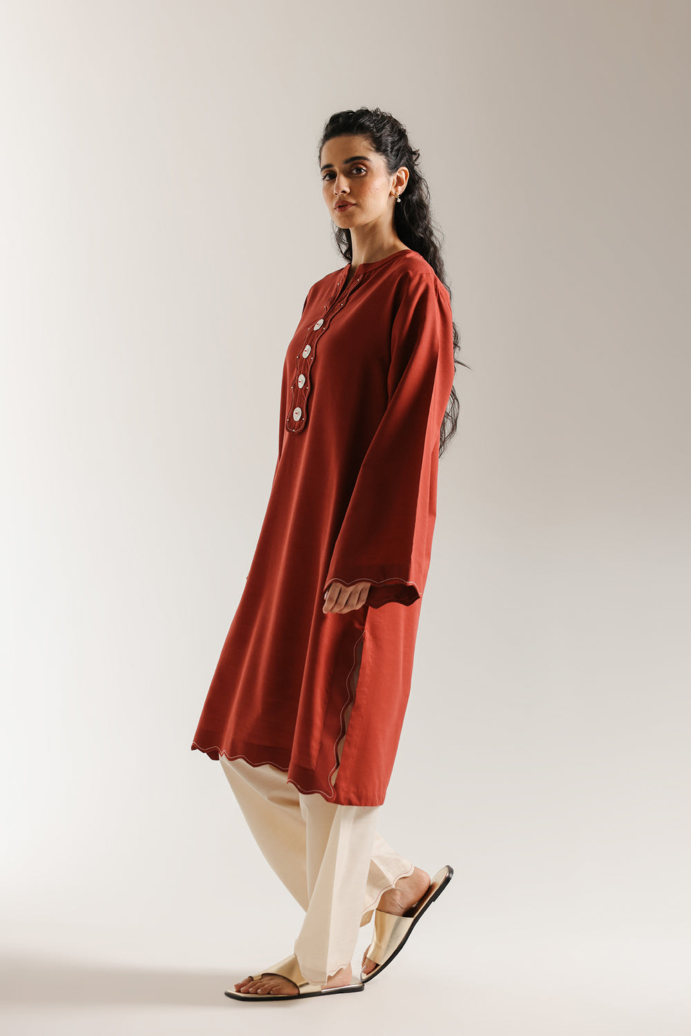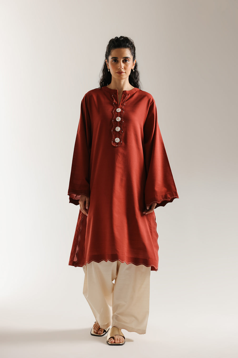 Unite simplicity with style in this striking solid suit. The long, A line-fit kurta is rendered in a rich, warm, reddish-brown color. It features a clean V-slit neckline accented by a row of beautiful large white decorative buttons. The wide sleeves and curved hemline are finished with subtle scalloped edges, adding a soft, textured detail to the solid fabric. The ensemble is completed by coordinating shalwar in a soft, contrasting cream/off-white color, creating a comfortable, stylish, and impactful look.