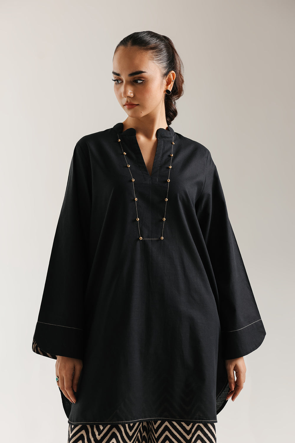 Exude contemporary sophistication in this striking printed suit. The ensemble features a relaxed, black kurta with a simple V-neckline and elegant, wide-flaring sleeves, accented with subtle contrasting stitch detailing at the hem and cuffs. This clean, modern top is perfectly balanced by the statement-making trousers, which showcase a bold, monochrome chevron print in black and off-white. This suit seamlessly merges minimalist design with graphic energy for an effortlessly chic look.