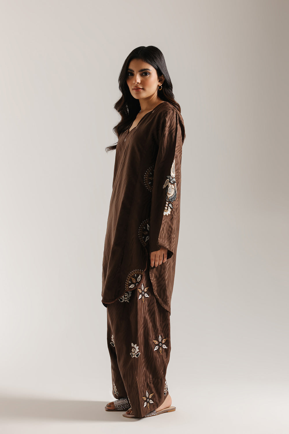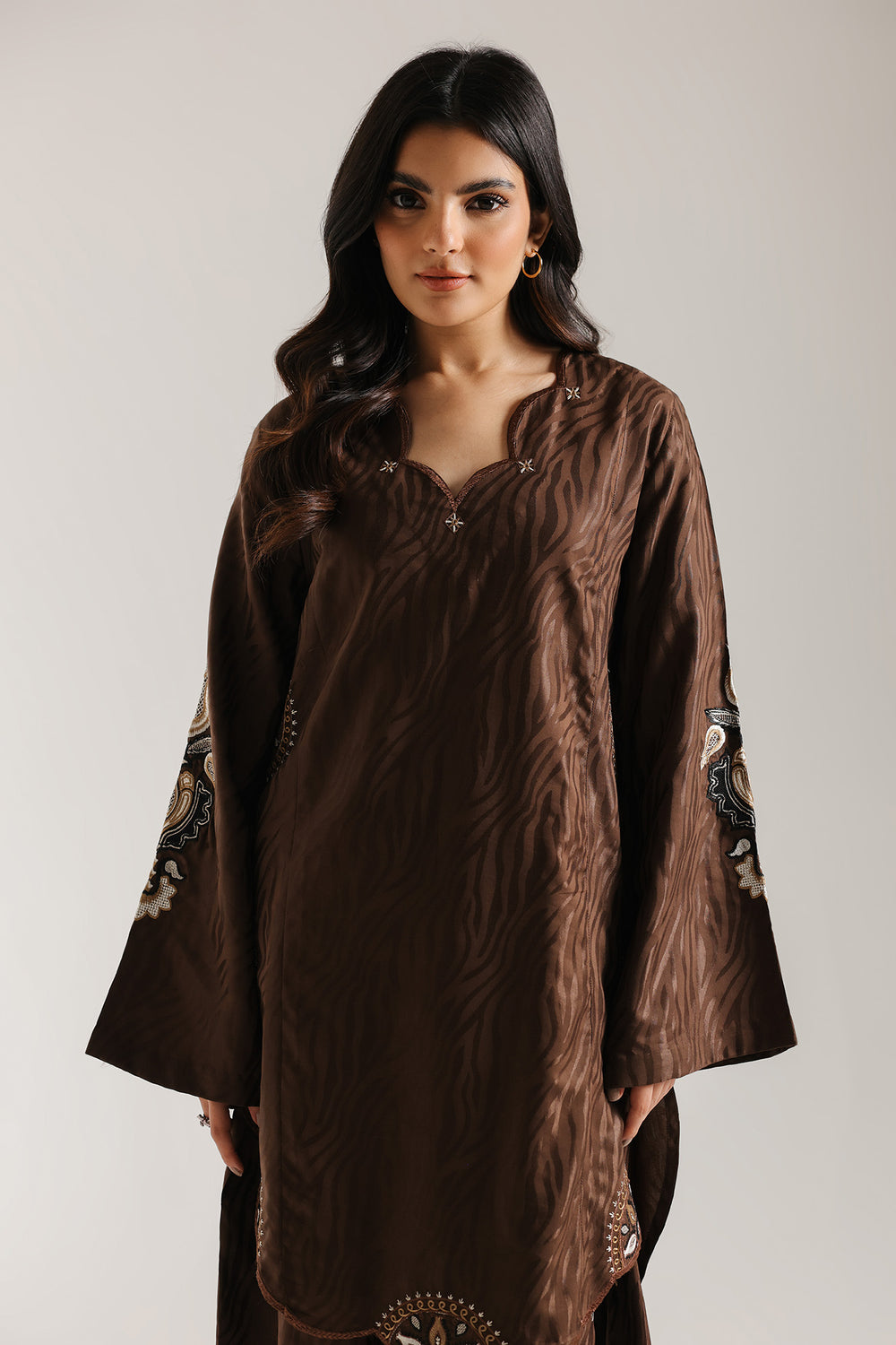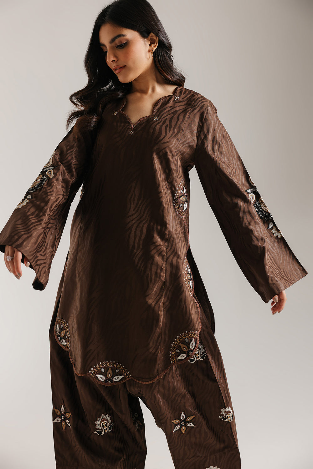 Unveil your bold, artistic side with this distinctive embroidered suit. This striking ensemble features a short kurti and wide-leg shalwar in a luxurious, deep chocolate brown fabric. The fabric of the kurti has a subtle abstract wave texture woven throughout. Both the shirt and shalwar are adorned with elaborate off-white and gold embroidery forming stylized floral and geometric motifs, the hem of the kurti and on the wide hem of the shalwar. The kurti features a scalloped V-neckline, creating a rich, textural, and opulent monotone look.