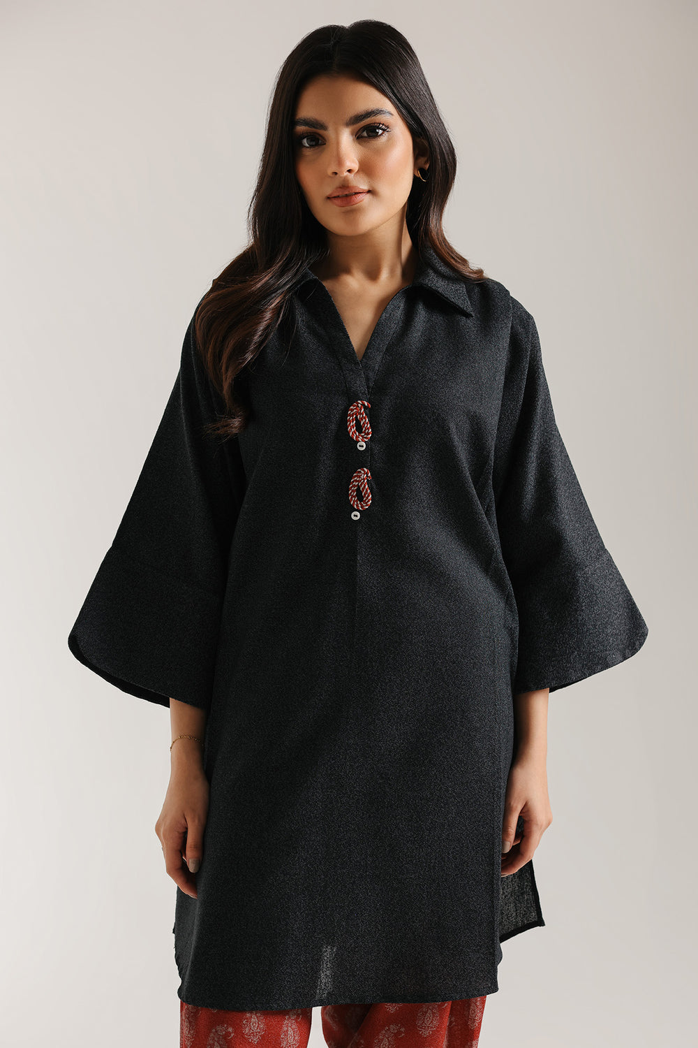 Discover understated elegance with this two-piece printed suit that seamlessly blends tradition with modern sensibility. The shirt features a sophisticated deep black base enhanced by twisted thread paisleys at front neck in contrasted deep maroon and white hues. Paired with relaxed-fit contrasted deep maroon shalwar adorned with contrasted pale white paisley motifs against the same verdant backdrop, this ensemble strikes a compelling balance between tailored precision and playful personality. The medium-length silhouette and thoughtfully coordinated pieces create a versatile option for both casual and semi-formal occasions, offering the wearer a distinctive yet wearable aesthetic.