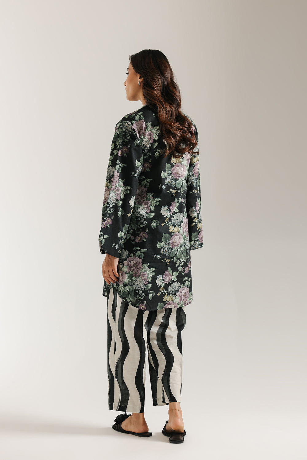 Command attention with this bold and artistic black printed suit. The short, straight-cut kurta is adorned with a sophisticated all-over floral print in muted tones of pale pink, lavender, and sage green. It features a classic scalloped V-neckline, along with elegant, wide sleeves. The ensemble is elevated by the striking, straight fit trousers which feature a bold, monochromatic wavy stripe pattern. The combination of the classic floral top and the modern striped bottom creates a captivating, mixed-print statement look.