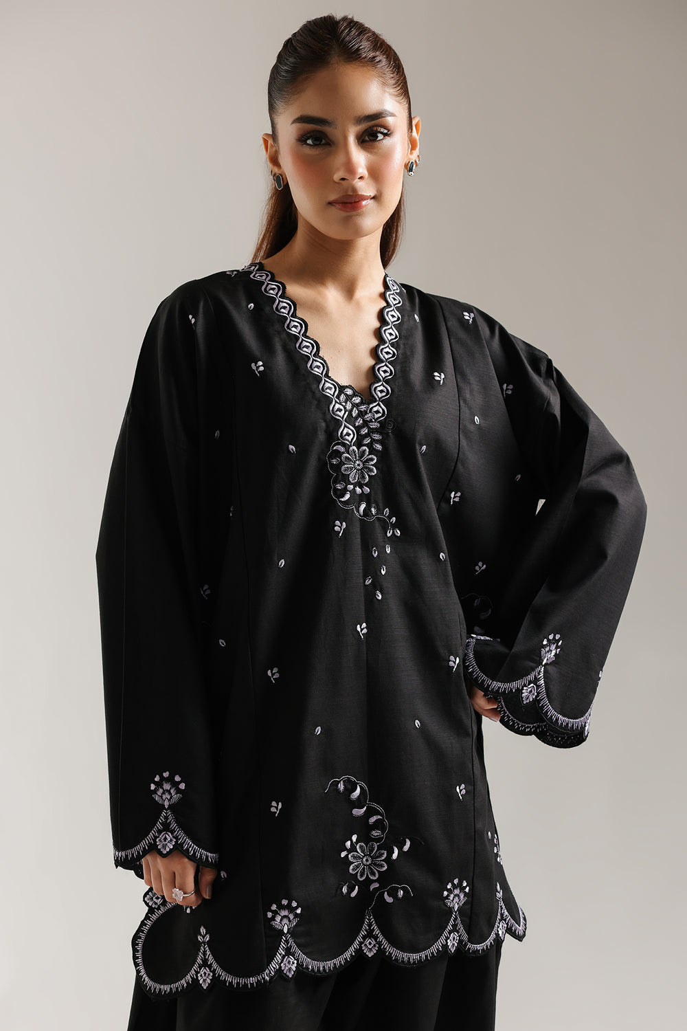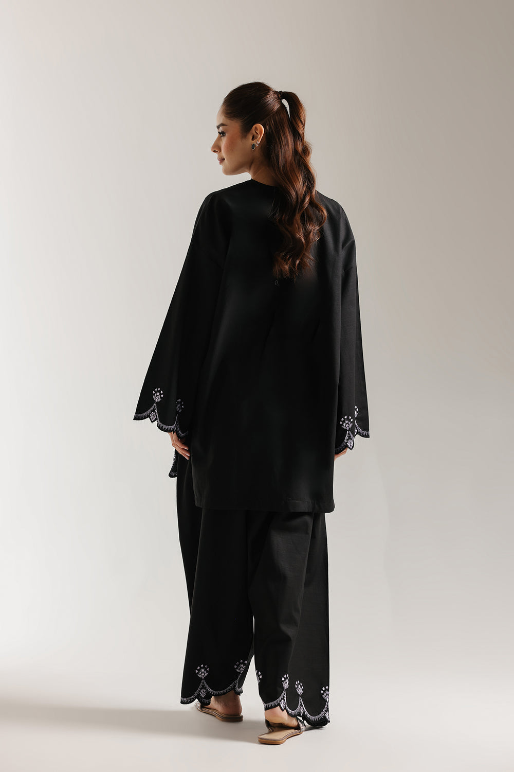 This sophisticated embroidered suit combines traditional artistry with modern design sensibilities. Featuring light subtle embroidery set against a deep black foundation, the composition includes a tailored short kurta and coordinating shalwar. Both pieces showcase expertly executed scalloped borders that blend heritage craftsmanship with contemporary aesthetics. The intricate needlework demonstrates exceptional attention to detail, while the curved hemlines introduce a refined, polished dimension. An ideal selection for significant celebrations, formal events, or occasions demanding an elegant, impactful ensemble.