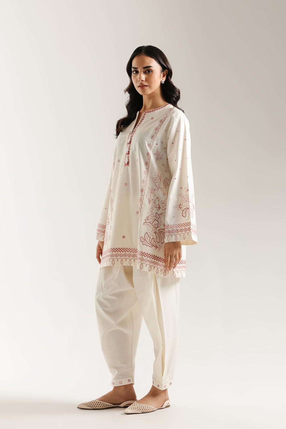 Envelop yourself in the delicate artistry of this serene embroidered suit. The beautiful off-white fabric is adorned with exquisite blush pink embroidery in traditional floral and paisley patterns that trace the neckline, hem, and cuffs of the A line kurta. The kurta features a sleek silhouette with a split V-neckline finished with subtle button details. The ensemble is perfectly complemented by voluminous yet tailored shalwar trousers in the matching off-white hue, creating a look that is both refreshingly light and deeply elegant.