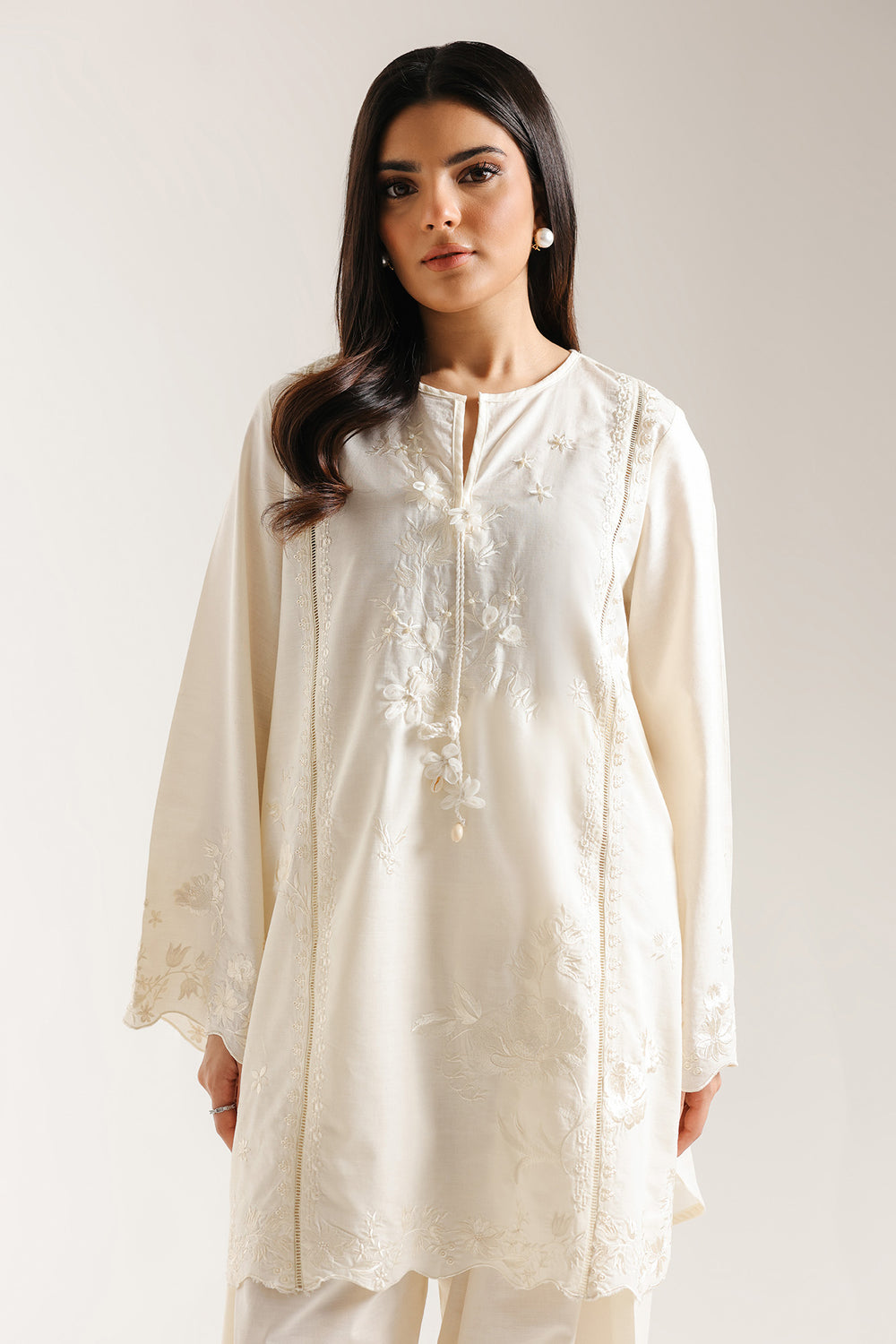 Embrace delicate grace with this elegant ivory embroidered suit. The ensemble features a short kurti in a sophisticated off-white fabric. It is adorned with subtle, tone-on-tone white floral embroidery that trails delicately down the front panels and around the cuffs of the flared sleeves. The hemline of the shirt is finished with an exquisite scalloped edge. Paired with comfortable, coordinating loose fit shalwar, this suit offers a refined and effortlessly chic look, perfect for special gatherings or daytime formal events.