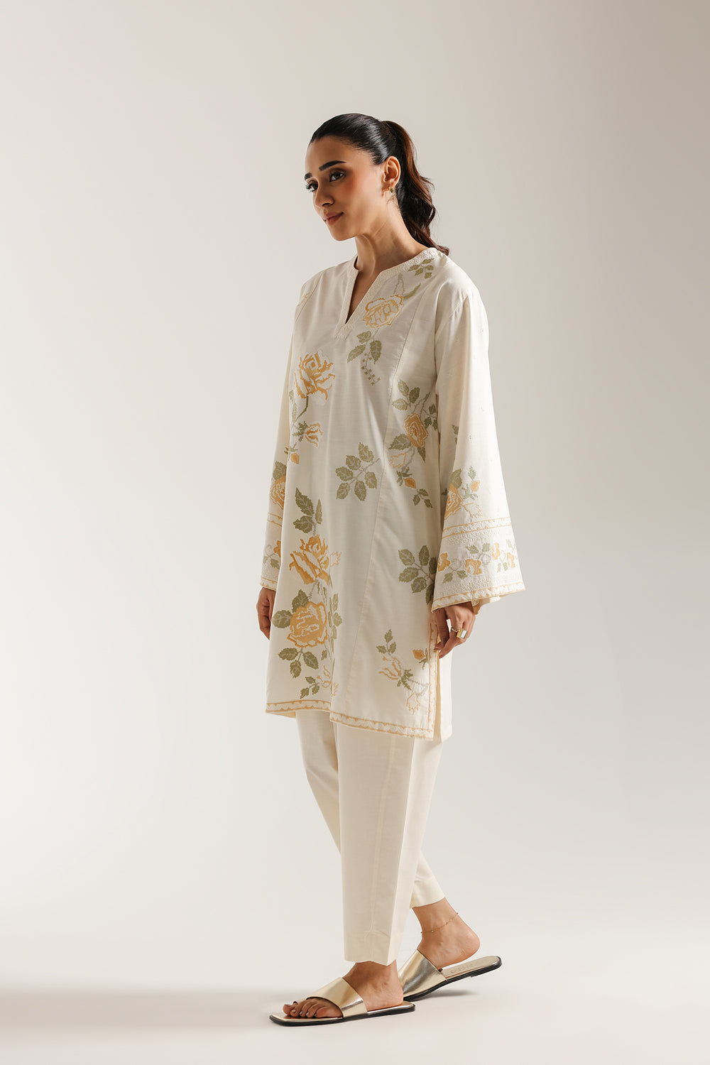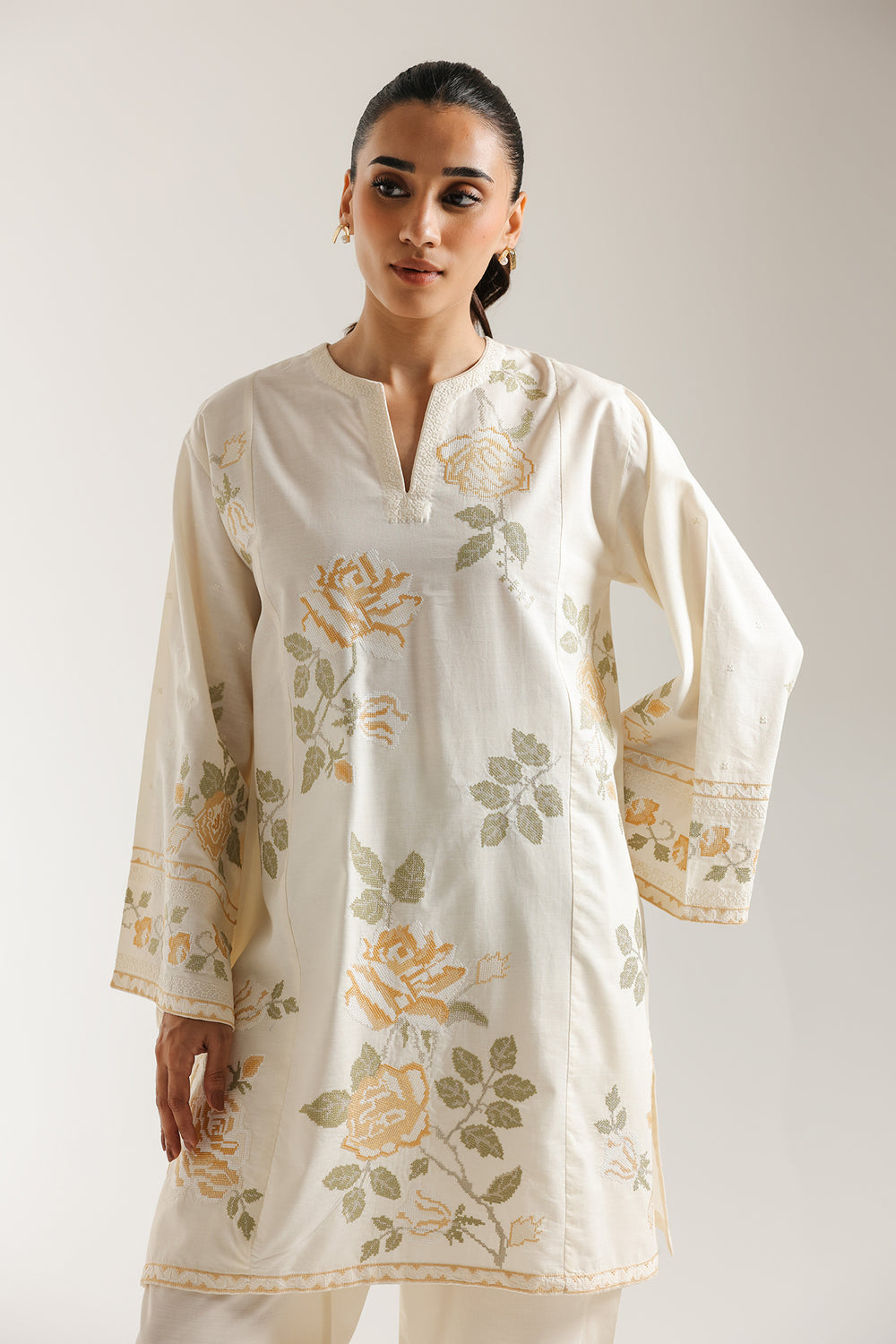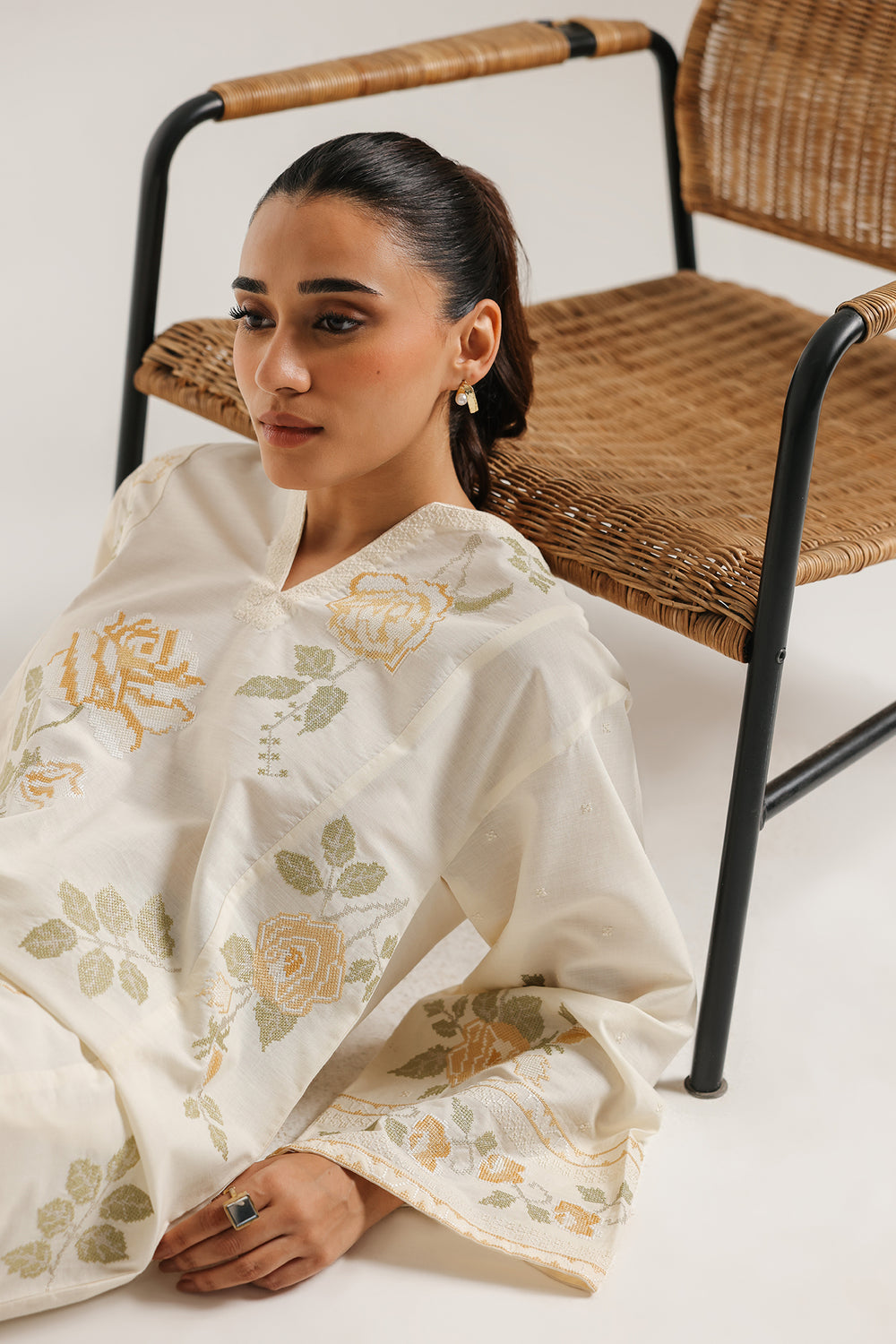 Celebrate effortless beauty with this charming off-white embroidered suit. The short shirt is crafted in a creamy white fabric and features delicate floral thread embroidery in soft yellow and pale sage green, creating a romantic, trailing rose effect. It includes a subtle V-slit neckline, and a graceful A-line silhouette. The wide, relaxed sleeves are finished with coordinating embroidered borders. The ensemble is completed by matching loose fit shalwar in the same clean, off-white hue. This suit offers a fresh, light, and wonderfully feminine look.