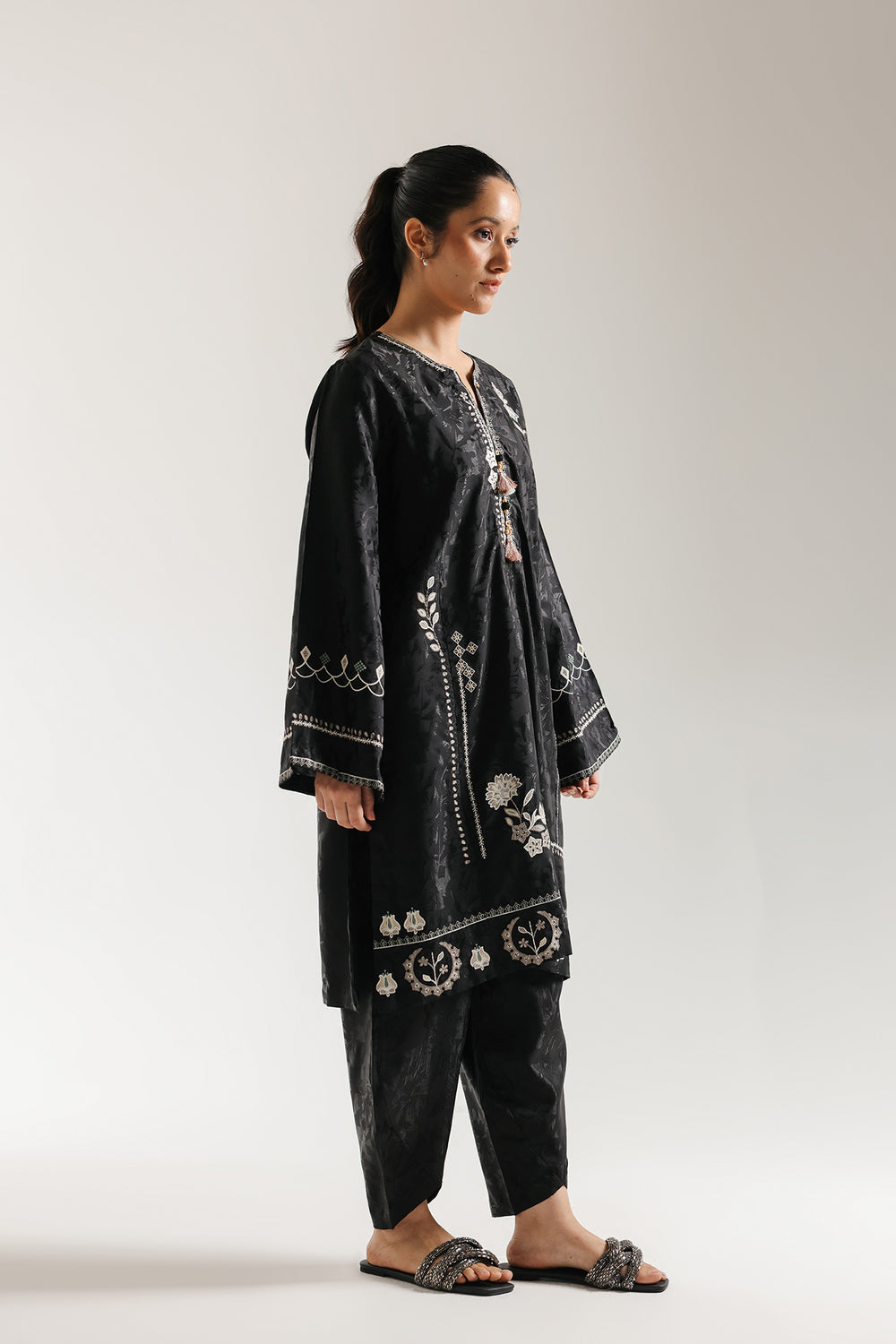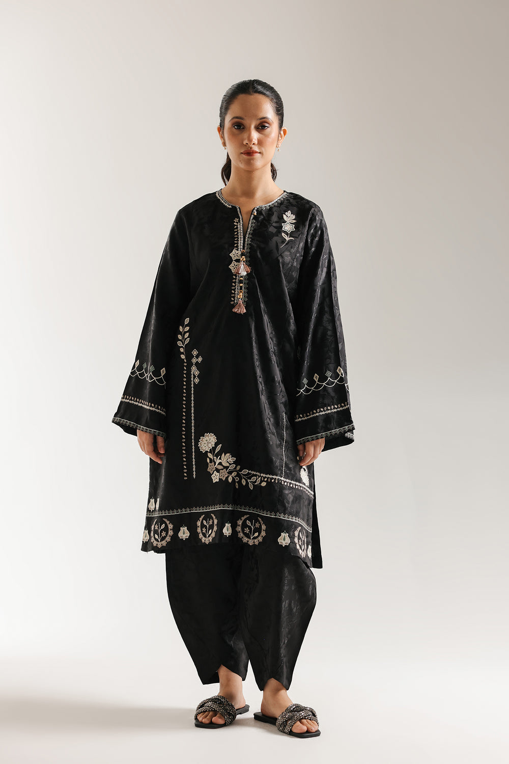 Envelop yourself in dramatic elegance with this black embroidered suit. The straight-cut kurti is crafted from a black jacquard fabric with an all-over tonal floral pattern, giving it a subtle sheen and texture. It is gorgeously accented with elaborate silver and brown thread embroidery in stylized floral motifs down the front, on the sleeves, and along the hem, with tassels adding a playful touch to the neckline. Completing the look is a set of matching black tulip-style shalwar in the same textured fabric, creating a rich and sophisticated monochromatic ensemble.