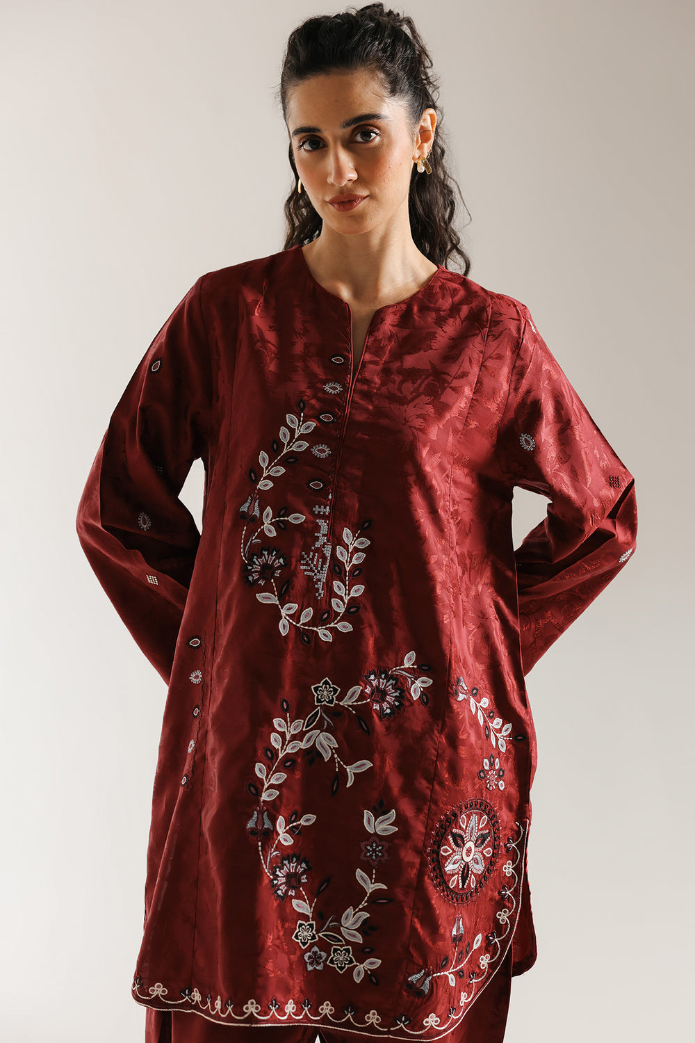 Immerse yourself in rich color and texture with this stunning maroon embroidered suit. The short, straight-cut kurta is crafted from a luminous maroon jacquard fabric that features a subtle tonal, all-over floral pattern woven into the material. The shirt is beautifully detailed with elegant thread embroidery in black, white and subtle grey, forming delicate floral vines across the yoke and down the front. The V-slit neckline and hemline are finished with refined white piping. The ensemble is completed by coordinating shalwar in the same rich maroon jacquard fabric, creating a comfortable, luxurious, and perfectly monochromatic traditional look.