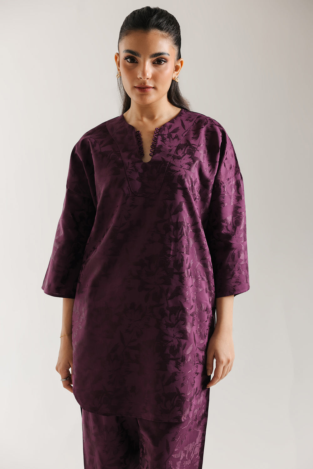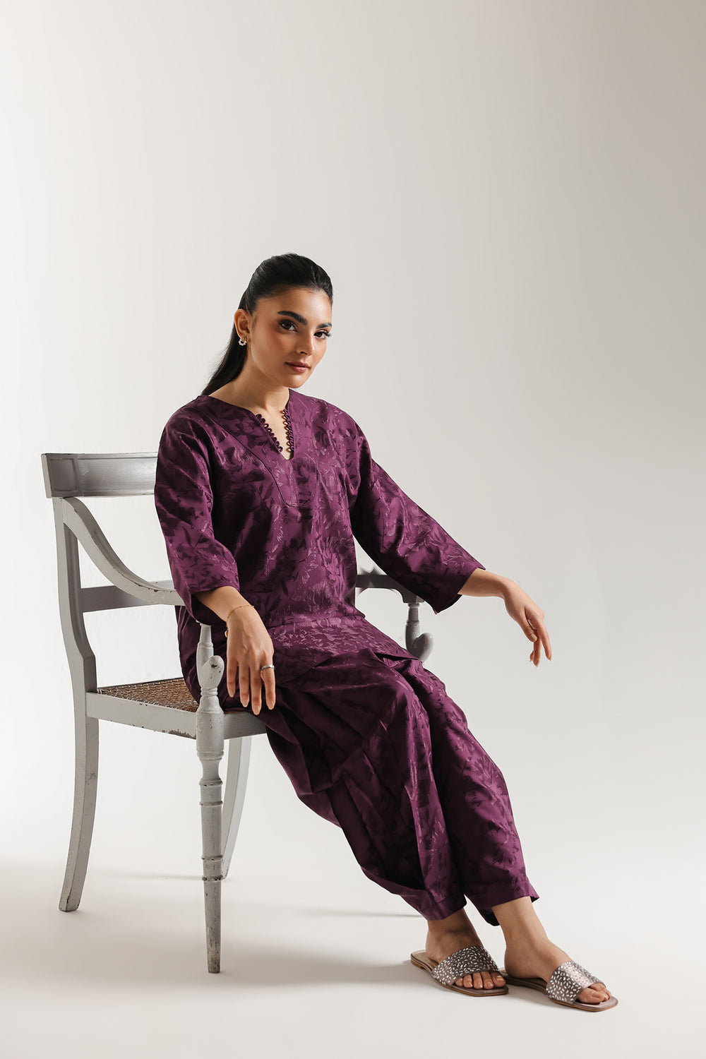 Command attention with the luxurious texture and rich color of this striking suit. The ensemble features a short kurti and matching shalwar crafted in a deep, vibrant plum purple fabric. The fabric itself is the star, showcasing a sophisticated tonal jacquard weave pattern. The pattern appears to be floral based, providing depth and sheen to the rich color. The shirt features a simple yet elegant V-neckline and wide sleeves. This monochromatic set offers a polished and instantly chic look for any evening or semi-formal occasion.