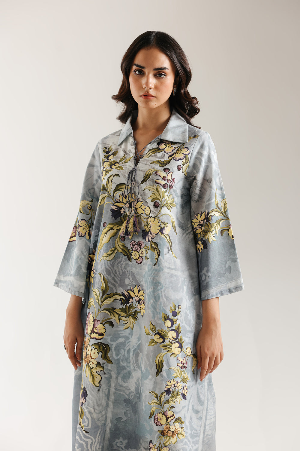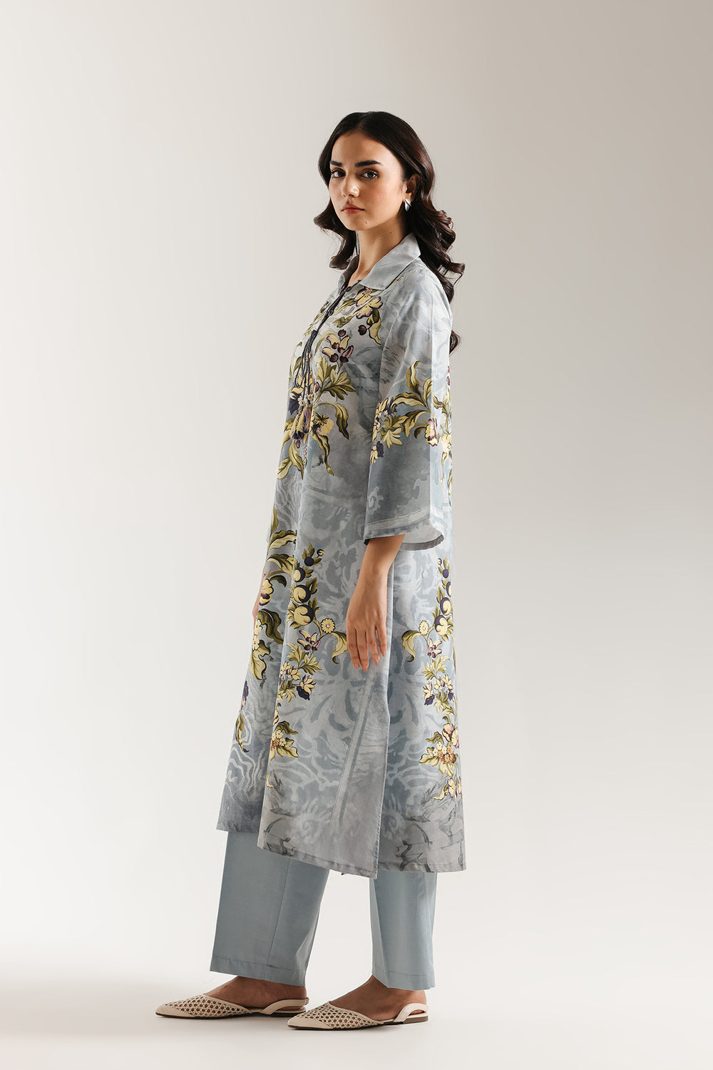 Envelope yourself in the soft, artistic beauty of this exquisite printed suit. The long, straight-cut kurta features an all-over, painterly floral print in shades of dusty blue, cream, and olive green. The design includes a collared split neckline finished with intricate tassel detailing. The ensemble is elegantly completed with perfectly matched straight-fit trousers in a solid, complementary light blue, offering a refined and effortlessly chic look.