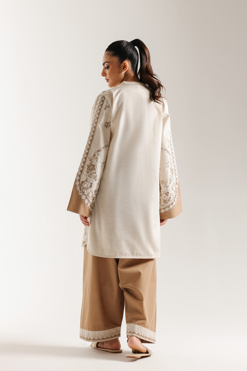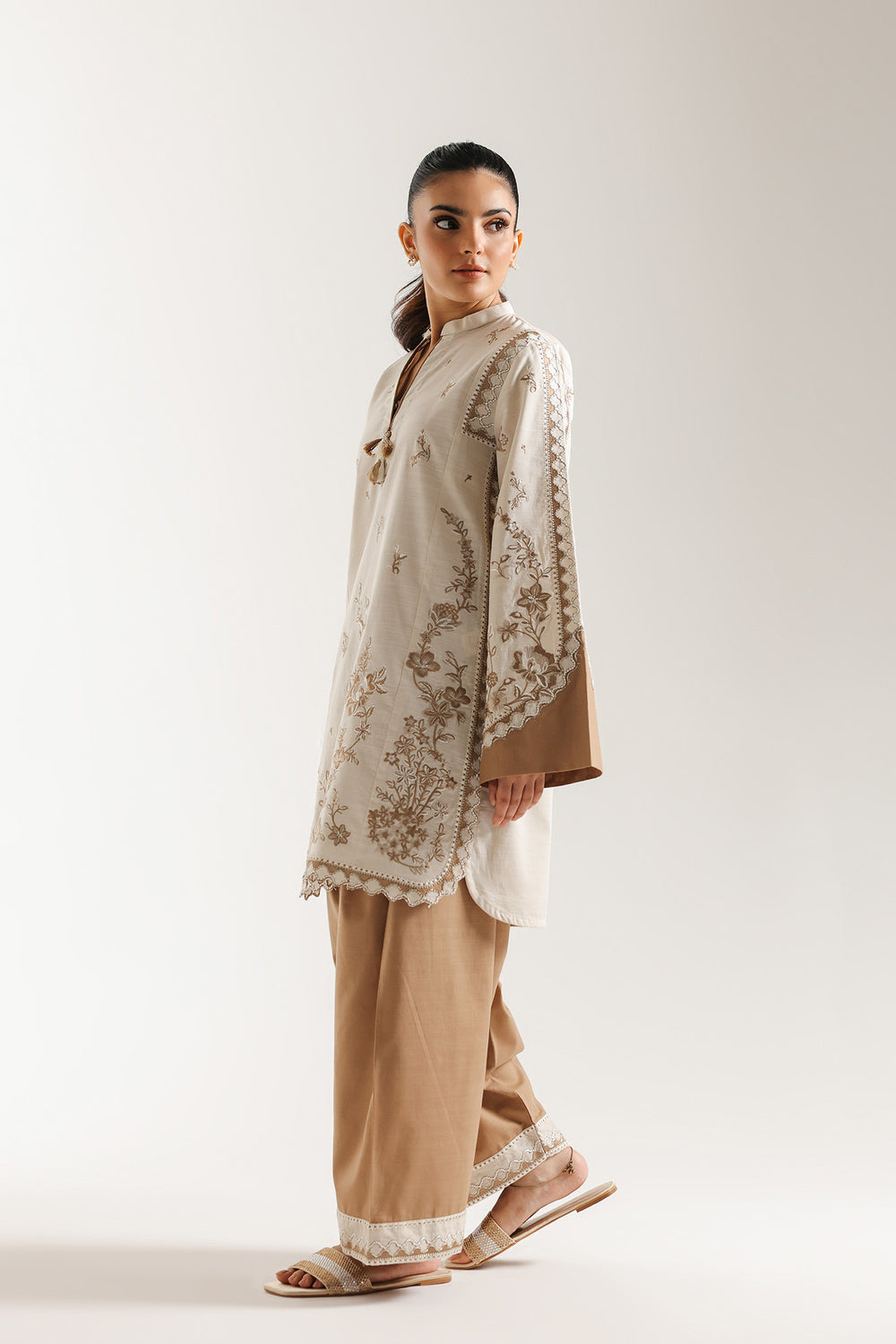 Adorn yourself in the subtle elegance of this embroidered suit. This sophisticated ensemble features a short-length kurti and wide-leg shalwar. The shirt is crafted from a smooth, off-white fabric and is delicately embellished with fine bronze and gold-toned embroidery in a scrolling floral pattern down the front and along the hem. It features a ban neckline with a slit, accented by small fabric tassels. The wide sleeves are finished with a broad, contrasting cuff in a solid camel or tan shade. The shalwar provide an earthy balance, created in a solid camel color and finished with a subtle embroidered white border at the hem.