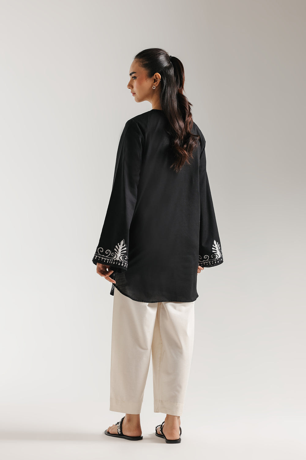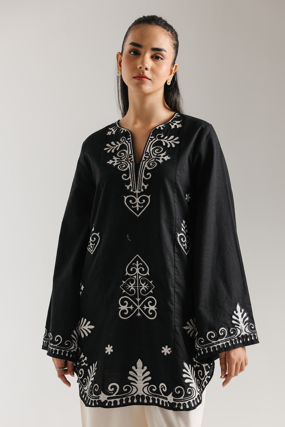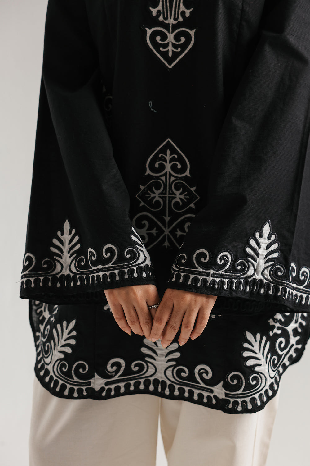 Make a bold statement in timeless black. This elegant kurta features intricate white embroidery along the neckline, sleeves, and hem, blending traditional artistry with a modern silhouette. Designed with flared sleeves and a relaxed fit, it offers both comfort and sophistication—perfect for festive gatherings, evening outings, or refined everyday wear. Paired with crisp ivory trousers, this look embodies effortless grace and understated luxury.